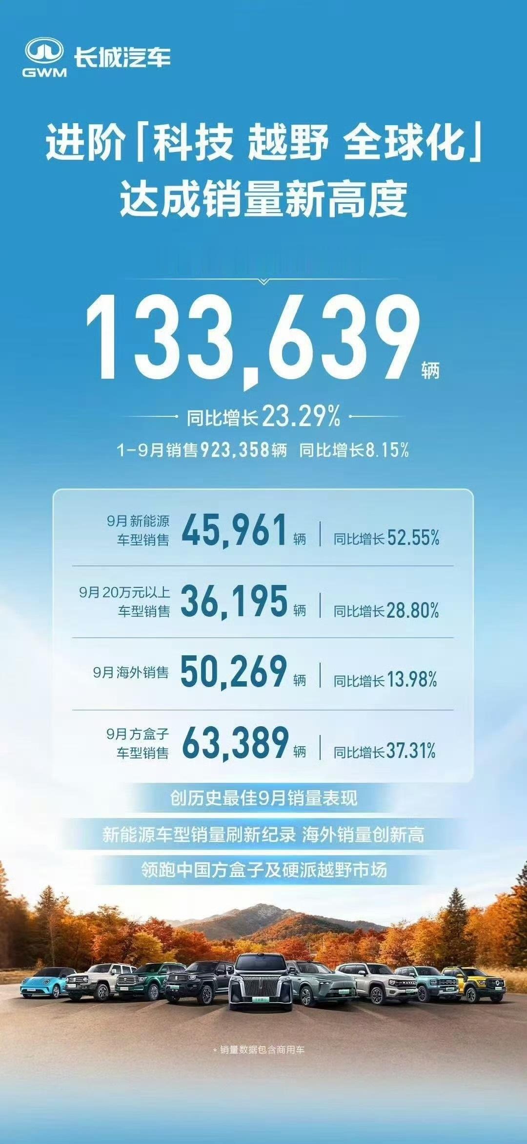 长城汽车9月销量133639辆,同比增长23.29%。1至9月累计销售923358辆,同比增长8.15%