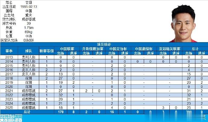 本场比赛,成都蓉城中场甘超补时替补登场,达成职业生涯200场里程碑,其中在贵州人和与北京人和出场21次,在深圳队出场47次,在成都蓉城出场132次。