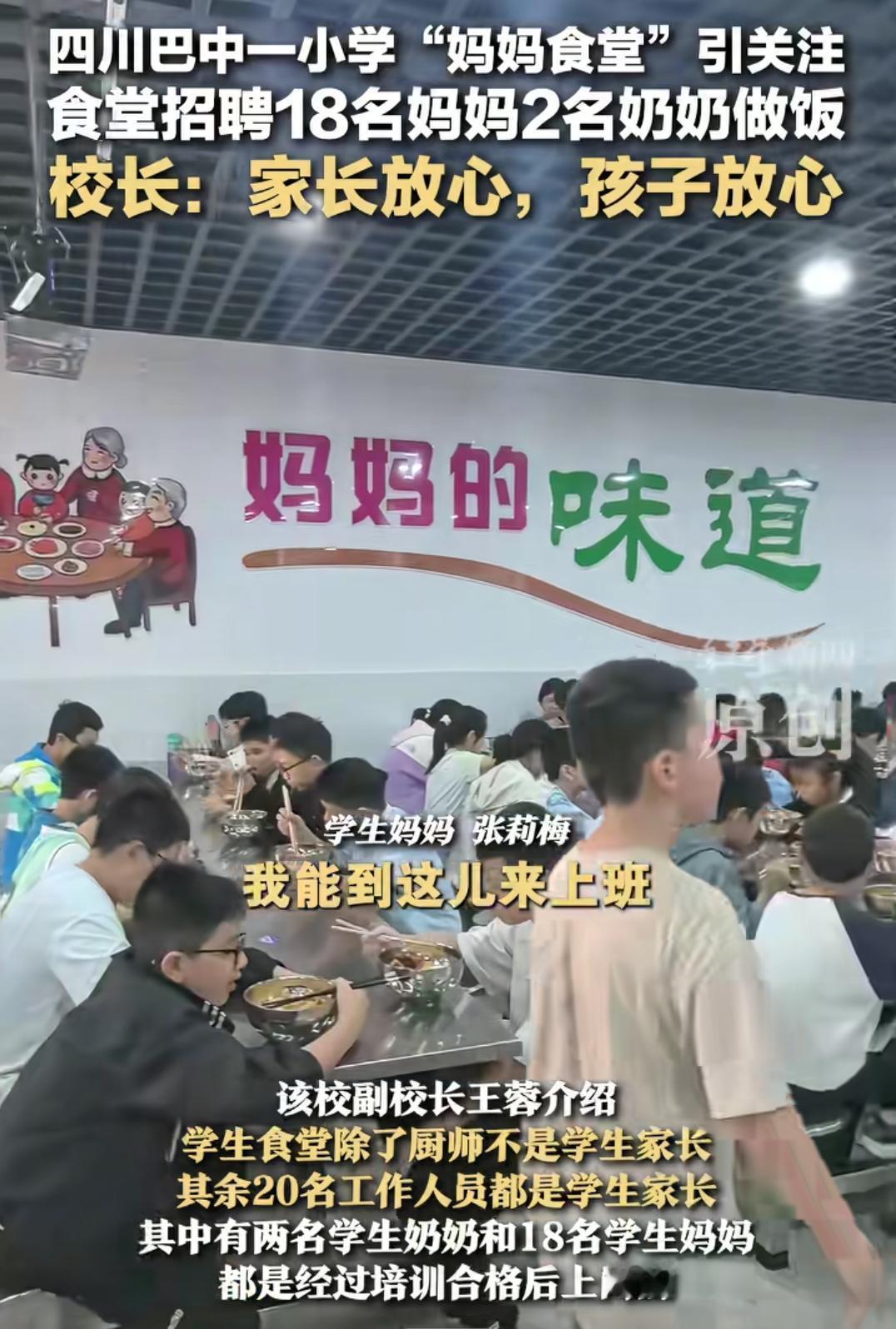 四川巴中打响了第一炮 令人意想不到,连上海都头疼的校园餐食安全难题,竟被这里一所小学找到了突破口! 这所小学建立妈妈食堂,招牌了18位妈妈和2个奶奶,除了厨师长不是家长,其余工作人员都是。这可太好了,家长放心了,孩子也放心。 其实道理很简单,只要有人想在学生食堂里谋利,想算计利用权力谋利,基本就没好了。 但是妈妈们却不会,自己的孩子都在学校里,她们也都想让孩子吃好吃得干净,不会偷工减料啥的,顺便还能监督一下学生的餐费有没有落实到位。 而且学校是给每位家长发放了2200元工资都,也不是无偿工作,这也是一举两得了,很多宝妈没有工作又不放心娃,来食堂工作正好,解决了就业问题。 也有网友表示,要是自己娃毕业了,这些妈妈工作还能保住吗?或者他们还能尽心尽力工作吗? 最好的方法其实就是校长主任老师跟学生一起吃,校内杜绝外卖跟小灶,大家怎么看呢