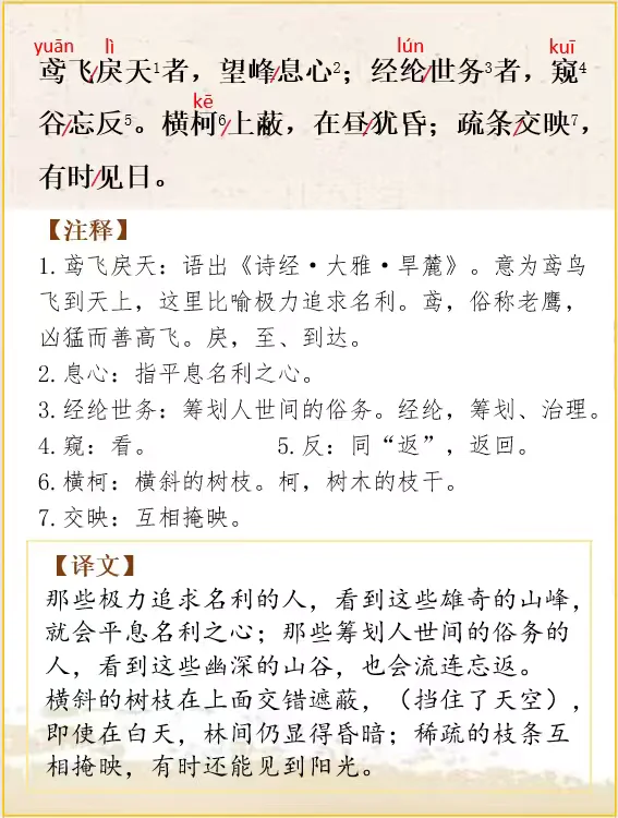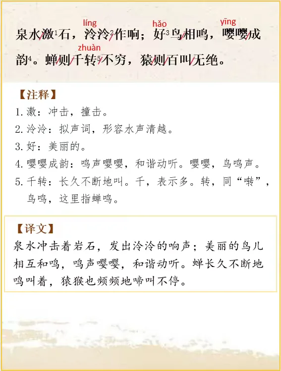 夹着江水的两岸的高山上,全都生长着浓密的树木,透出一派寒意,(山峦)凭借(高峻的)地势,争着向上,仿佛都在争着往高处远处伸展,(它们)争着比高,笔直地指向云天,形成千百座山峰。泉水冲击着岩石,发出泠泠的响声;美丽的鸟儿相互和鸣,鸣声嘤嘤,和谐动听。蝉长久不断地鸣叫着,猿猴也频频地啼叫不停。那些极力追求名利的人,看到这些雄奇的山峰,就会平息名利之心;那些筹划人世间的俗务的人,看到这些幽深的山谷,也会流连忘返。横斜的树枝在上面交错遮蔽,(挡住了天空),即使在白天,林间仍显得昏暗;稀疏的枝条互相掩映,有时还能见到阳光。