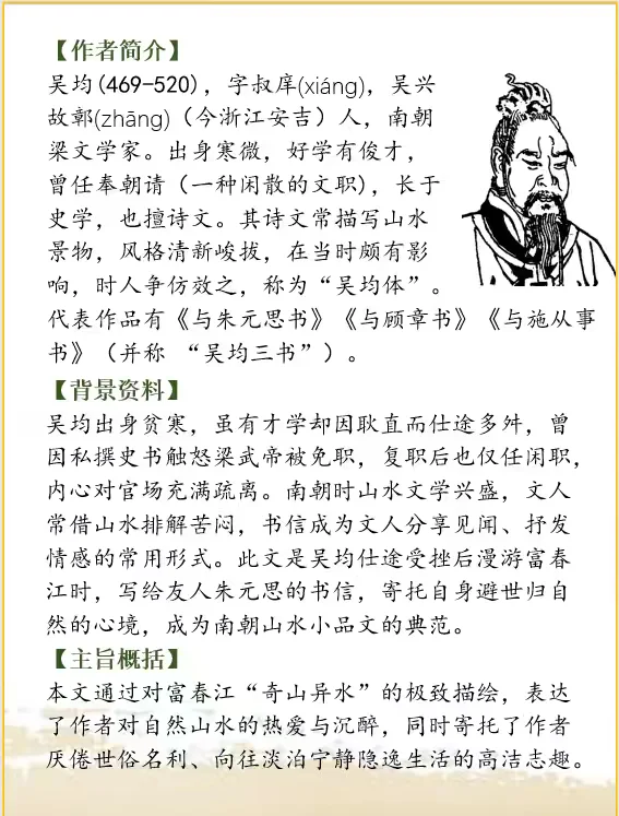 吴均出身贫寒,虽有才学却因耿直而仕途多舛,曾因私撰史书触怒梁武帝被免职,复职后也仅任闲职,内心对官场充满疏离。南朝时山水文学兴盛,文人常借山水排解苦闷,书信成为文人分享见闻、抒发情感的常用形式。此文是吴均仕途受挫后漫游富春江时,写给友人朱元思的书信,寄托自身避世归自然的心境,成为南朝山水小品文的典范。