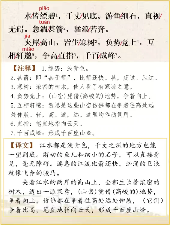 江水都是浅青色,千丈之深的地方也能一望到底。游动的鱼儿和细小的石子,可以直接看见,毫无障碍。湍急的江流比箭还快,汹涌的巨浪就像飞奔的骏马。