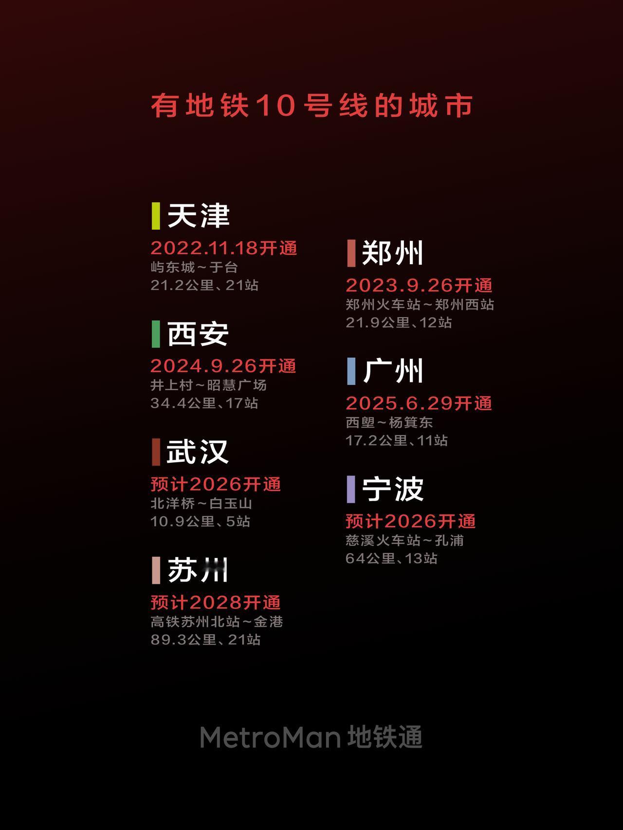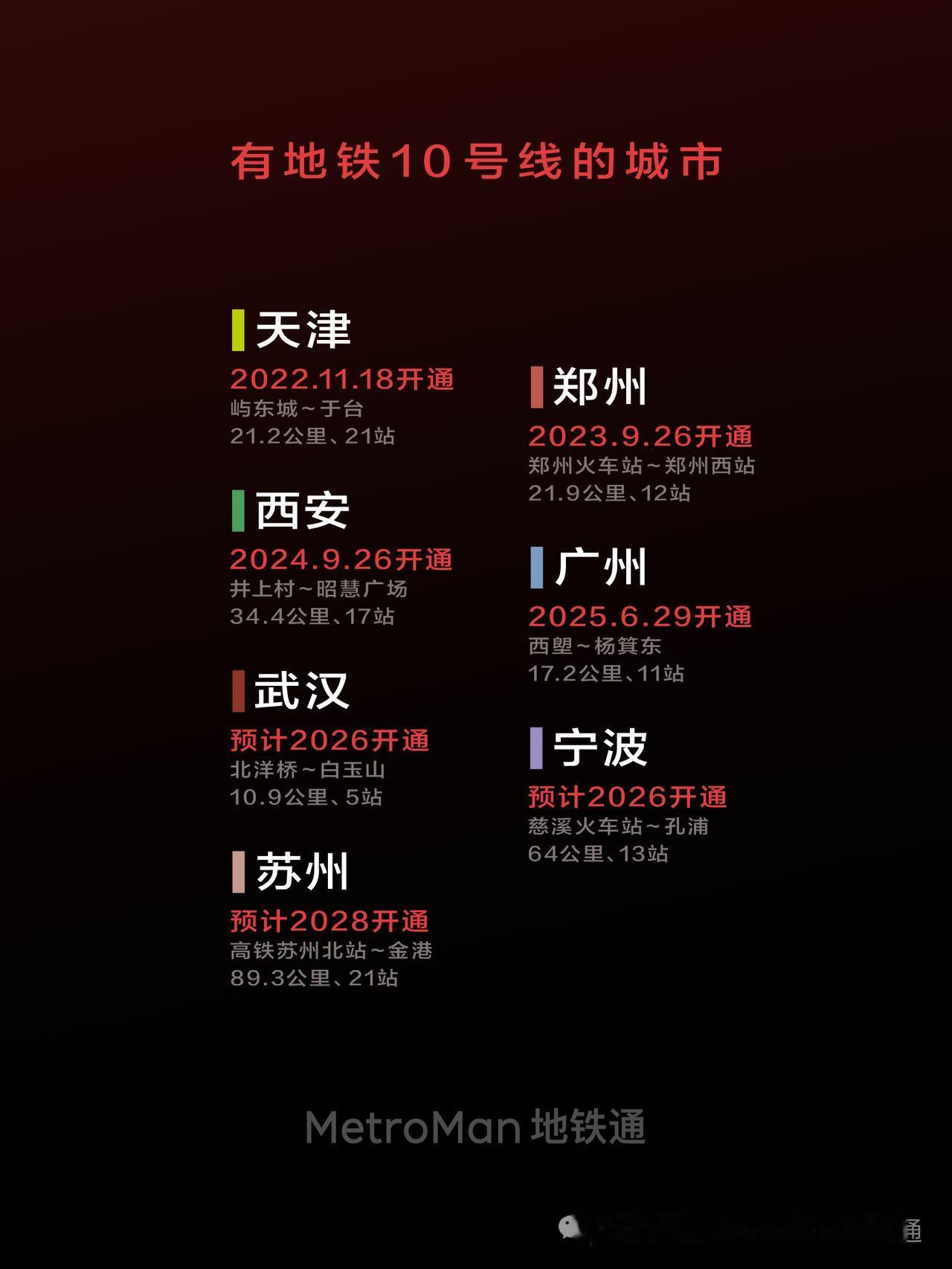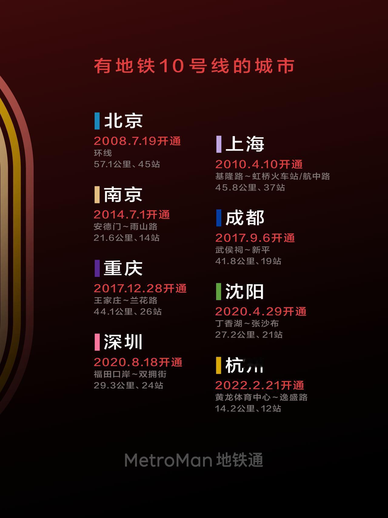 十月,秋风柔桂香浓 进入十月了,首先祝各位国庆长假快乐,上个月赶在月底前开通了不少地铁线路,就像进入秋天硕果丰收的季节,让大家及时体验,出游更方便。 目前全国有12座城市拥有编号10的地铁线路,其中最早开通的是北京地铁10号线,是当前北京客流最大的线路。另外还有三座城市的10号线正在建设中,预计会在接下来的几年内分别开通。 本月预计开通的是上海地铁2号线西延伸段,自国家会展中心站(原徐泾东)向西延伸一站至蟠祥路·国家会计学院站。