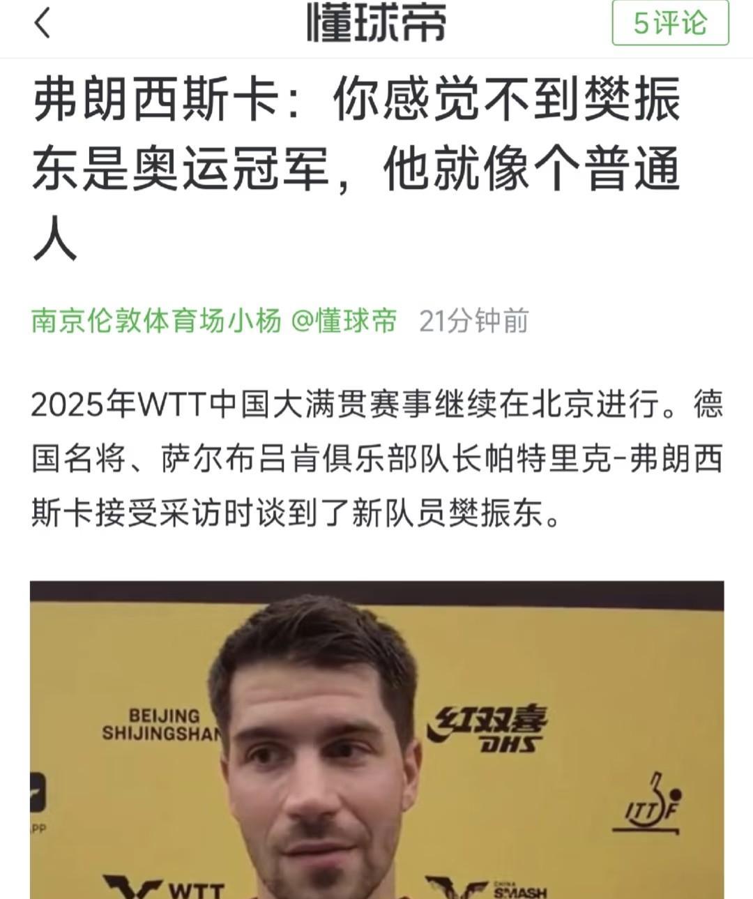 德甲俱乐部的队友队长弗朗西斯卡,才是让我见识到了正常的队友队长应该是什么样子,还有俱乐部的气氛可真阳间。 费朗西斯卡人品不错!是位很值得尊敬的外协球员!失利时鼓励,胜利时拥抱…再也不是一单两分难建功! 德国的男乒运动员一向都不错!从波尔、到奥恰洛夫、到丘党、还有弗朗西斯卡,都是值得尊敬的对手和朋友.