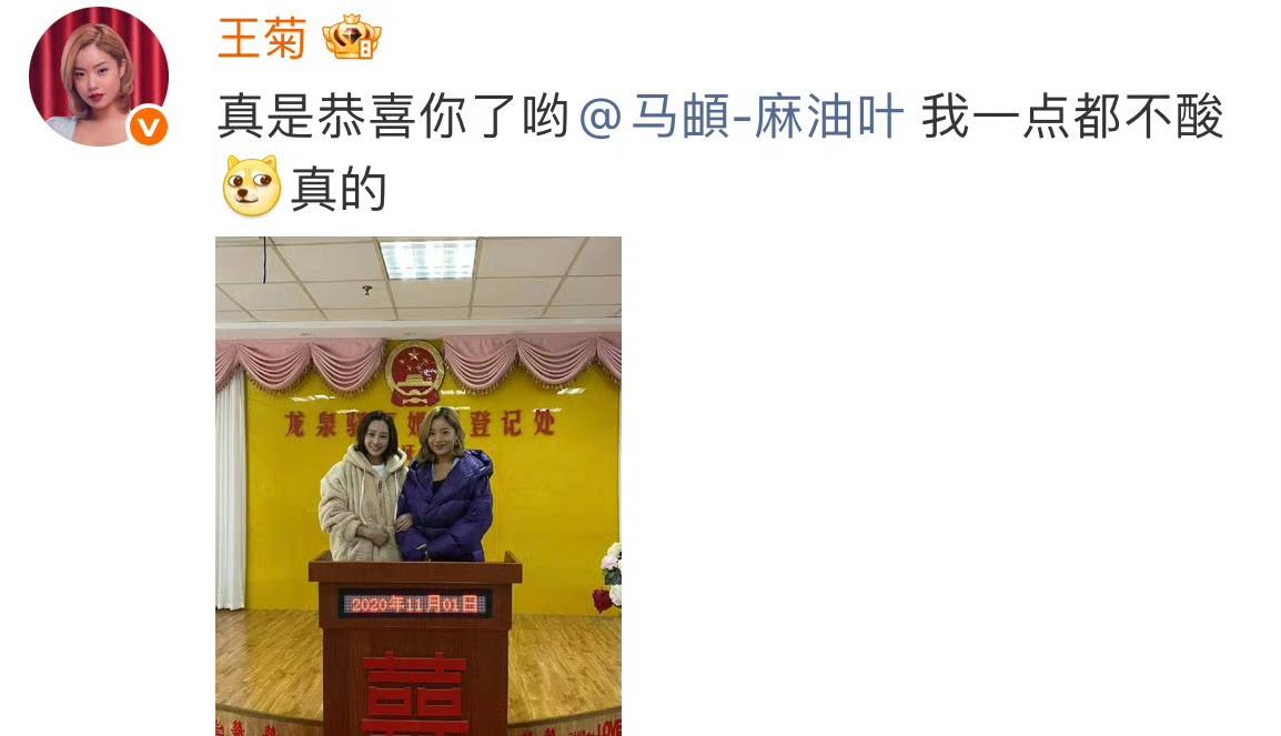 王菊“晒结婚照”回应李纯官宣!闺蜜情太好磕了 笑不活了!李纯和马頔今天官宣结婚,王菊直接晒出她和李纯的“结婚照”,还@马頔 说:“真是恭喜你了呦,我一点都不酸,真的!” 这波操作简直太逗了,隔着屏幕都闻到了醋味哈。 其实她俩关系这么好,全是因为之前一起录了《我家那闺女》。节目里王菊就疯狂cue马頔,还直接问李纯:“你俩结婚吗?” 当时李纯就一脸甜蜜地说“看他求不求”。 没想到这么快就真的领证啦!恭喜恭喜!🎉 所以王菊这哪是酸呀,分明是好闺蜜之间最铁的祝福方式!这样的友情也太让人羡慕了吧! 李纯马頔官宣结婚了 李纯 娱乐