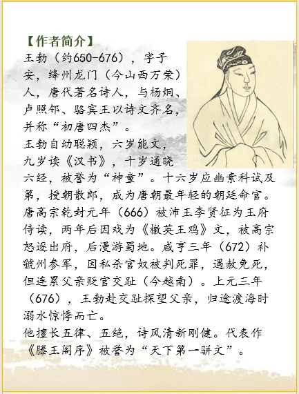 王勃(约650-676),字子安,绛州龙门(今山西万荣)人,唐代著名诗人,与杨炯、卢照邻、骆宾王以诗文齐名,并称“初唐四杰”。