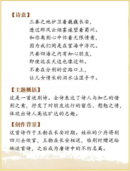 这首诗作于王勃在长安时期。姓杜的少府将到四川去做官,王勃在长安相送,临别时赠送给他这首诗,之后成为唐诗中的不朽名篇。