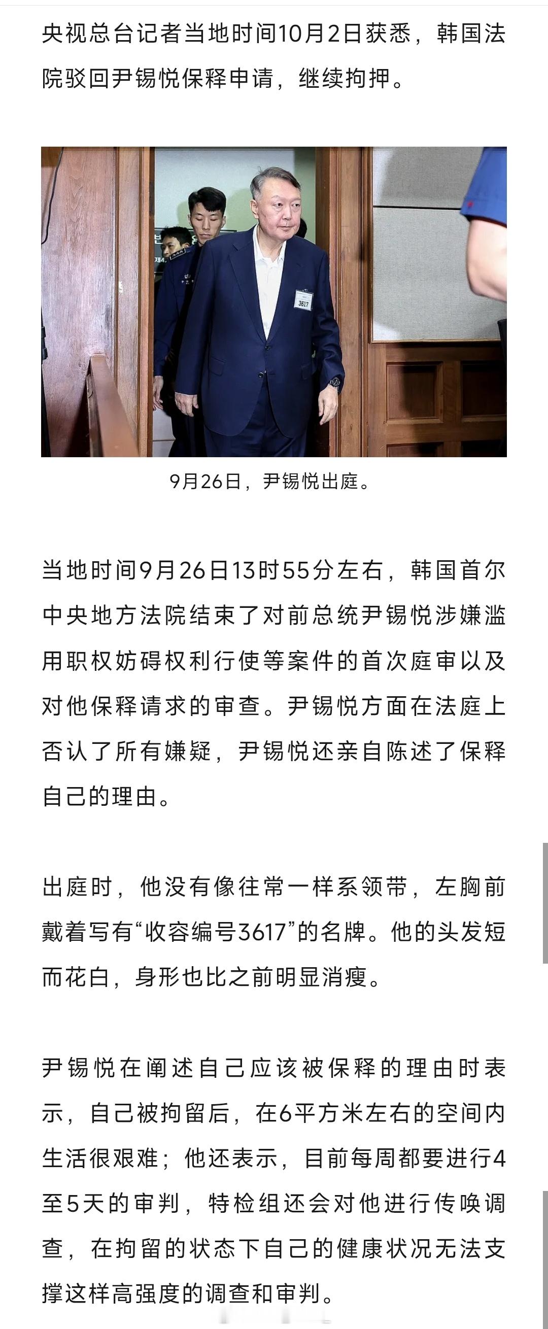 央视总台记者当地时间10月2日获悉,韩国法院驳回尹锡悦保释申请,继续拘押。热点现