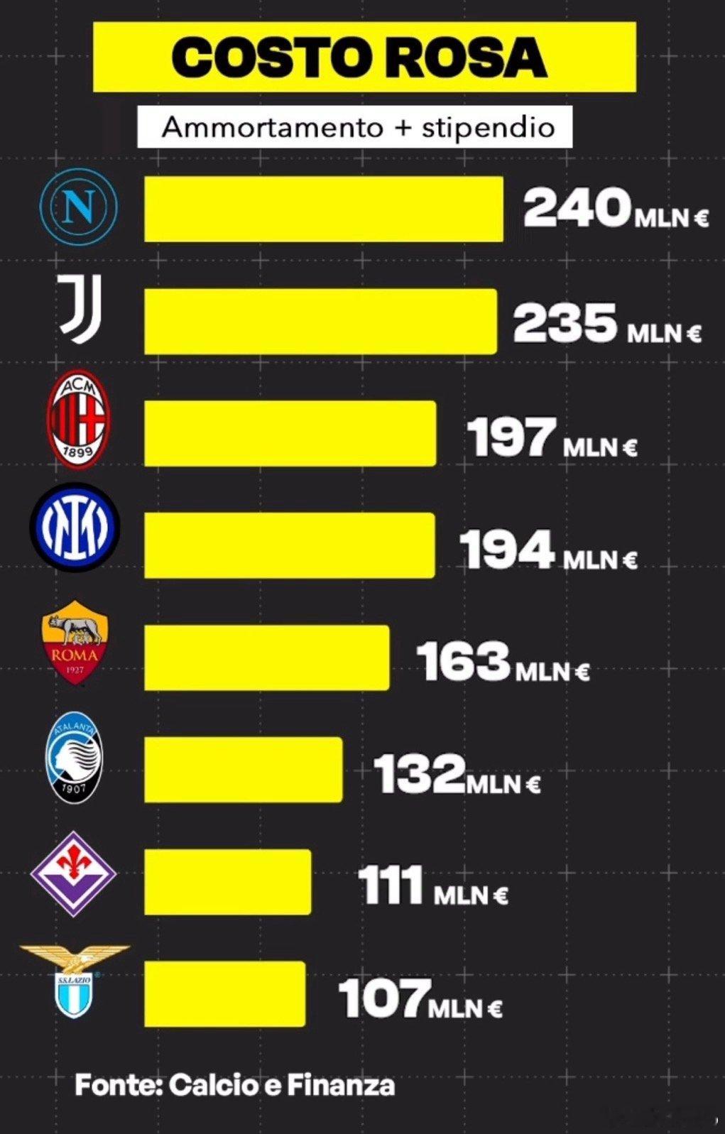 按球队成本(合同摊销+薪水)排名前 8 的意大利俱乐部如下