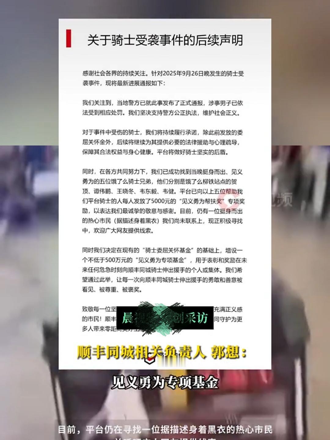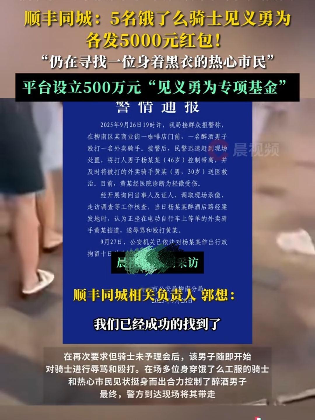 “这就是大企业的温度和速度!”近日,顺丰同城的骑手在等单时,遭到了醉酒男子的殴打。顺丰同城迅速做出了暖心举动。 事件经过:顺丰同城骑手在等单时,遭遇了醉酒男子的谩骂和殴打。看到这种情况,有5名穿饿了么服装的骑手和一位黑衣男子,迅速帮助控制施暴者,并协助报警,把被打骑手送至医院。 顺丰同城的相关负责人了解情况后,第一时间去医院探望被打骑手,并发给了骑手5000元委屈关怀金。后续,还会为骑手提供法律援和心理疏导。 同时,他们也找到了5位饿了么骑士,感谢他们的见义勇为。每人发放了5000元的见义勇为帮扶奖金。顺丰同城也在积极寻找当天见义勇为的黑衣男子。 针对这一事件,顺丰同城还将设立不低于500万元的见义勇为专项基金。这个基金就是为了表彰和奖励,未来任何危急时刻,向顺丰骑士伸出援手的集体和个人。 这就是大企业的温度和速度!顺丰同城不仅关心自己的员工,也有一颗感恩之心,对帮助过自己员工的人,也给予了感谢和奖励。 这不是每个企业都能做到的,通过这件事情的应对措施,让我们看到了顺丰是一个有人文关怀的企业。