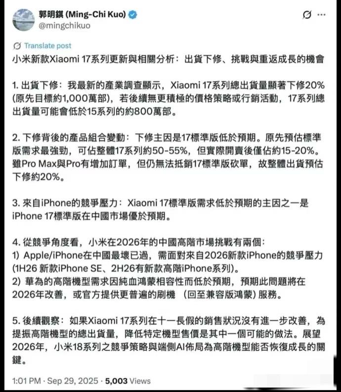 小米17系列销量超100万,这不是打脸郭明琪。 卢总说,小米17系列销量,目前销量确实已超过100万台,比往代速度更快。 这个销量,打脸了分析师郭明琪,小米17系列全生命周期超过1000万台是毋庸置疑的,国产第二旗舰妥了。 才一周,这个销量,妥妥的打脸郭明琪,那些不看好的也就口嗨而已,真摸到手机,身体就诚实了