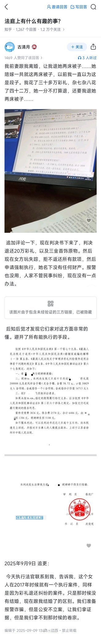 法院判决女方退还20万彩礼,以及三金首饰,结果女方玩失踪,拒不返还所有款项。