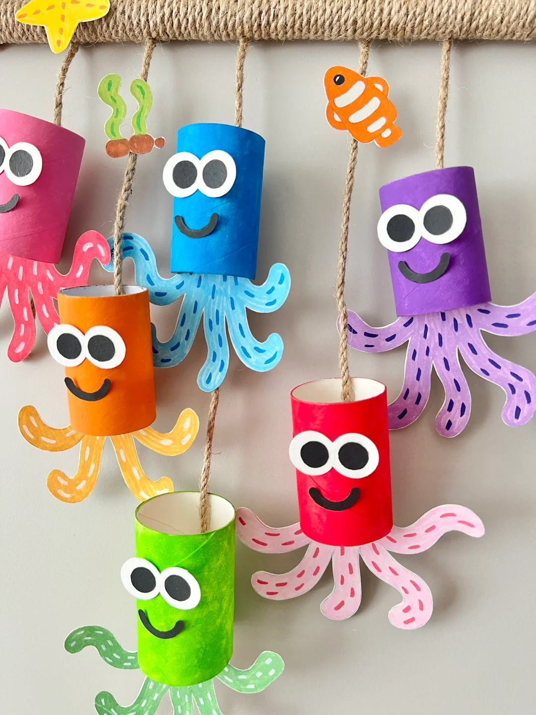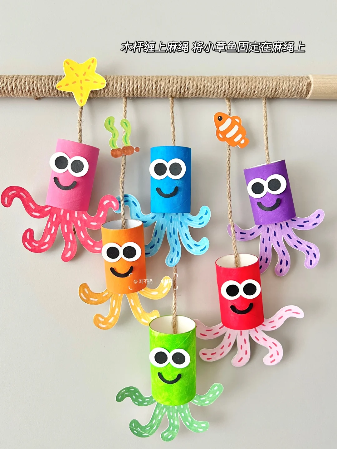 闲置的卷纸筒不要扔! 今天教大家用卷纸筒改造萌萌的小章鱼🐙挂饰~ 做法非常简单: 将卷纸筒裁成合适长度,上色晾干 在硬卡纸上画出章鱼脚脚和五官剪下,和身体拼贴在一起 木棍缠上麻绳,将小章鱼固定在上面就👌啦~ 变废为宝 省💰又环保♻️ 一起来做吧…