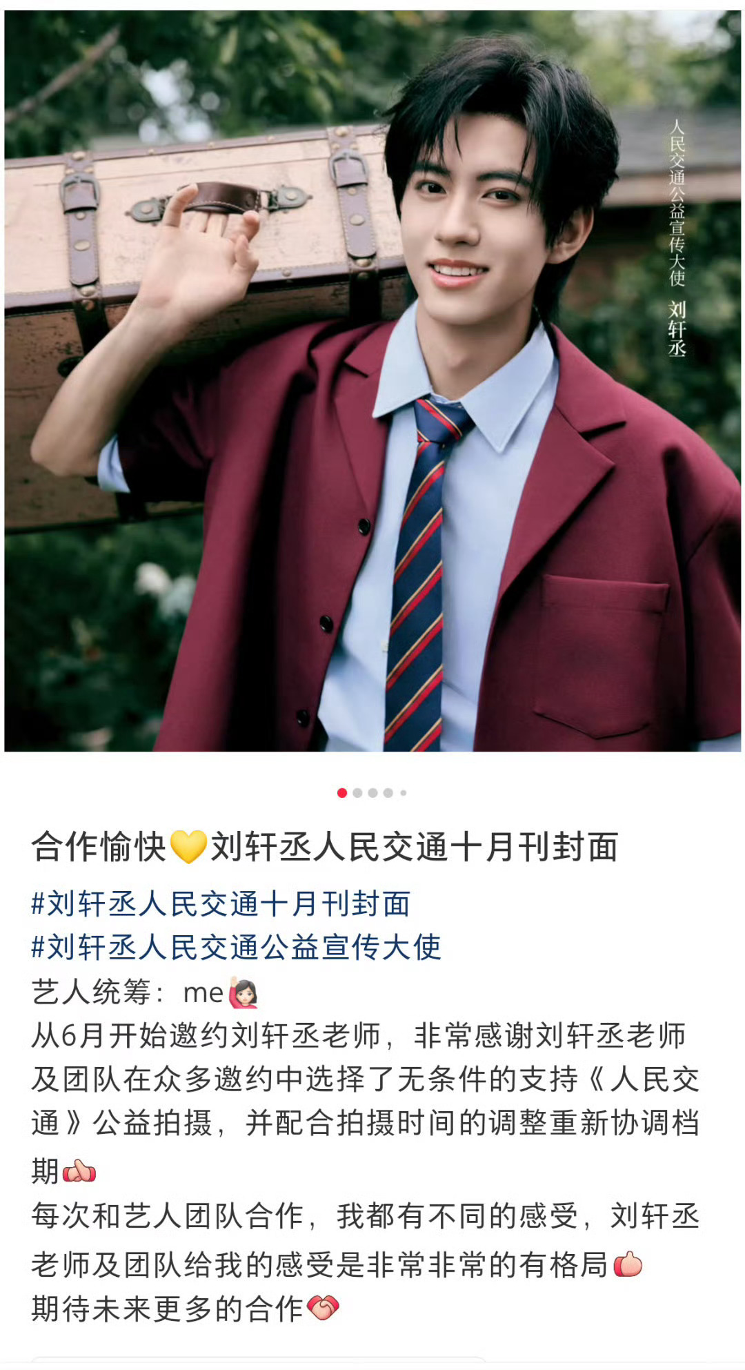 刘轩丞美谈+1:“非常感谢刘轩丞老师及团队在众多邀约中选择了无条件支持《人民交通》公益拍摄,并配合拍摄时间的调整重新协调档期”
