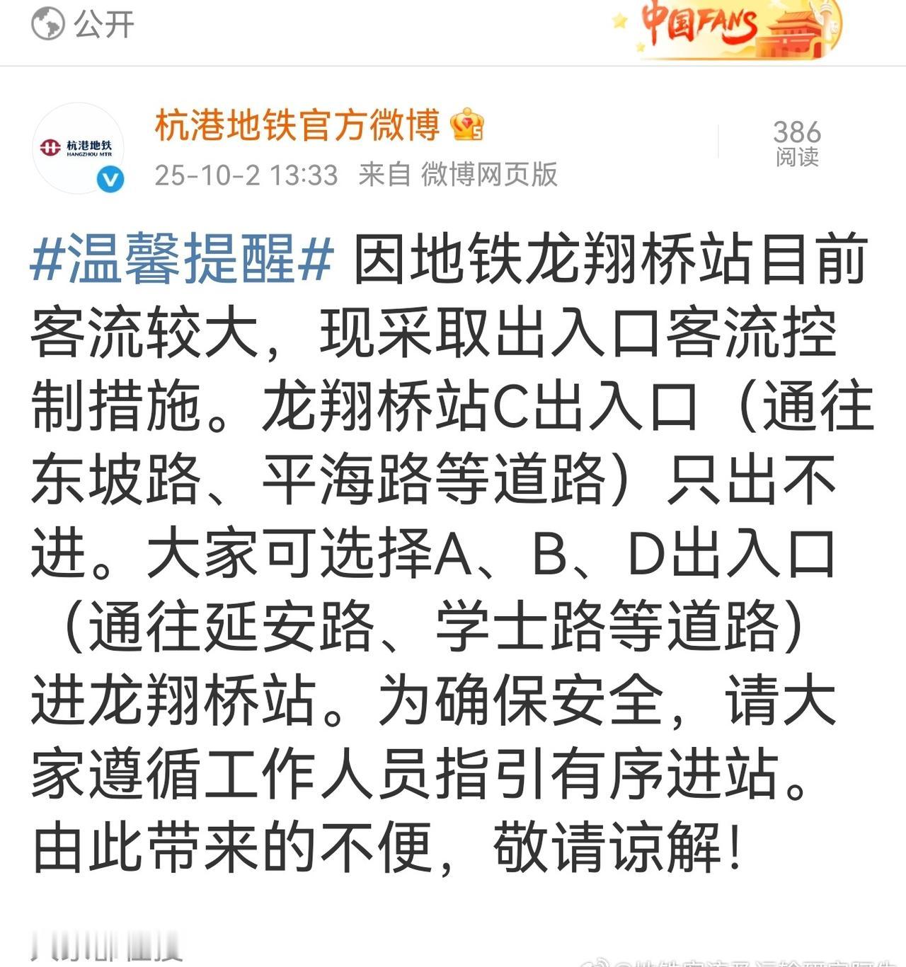 网友2025年10月2日(星期四国庆假期第二天)14:00杭州地铁6号线往