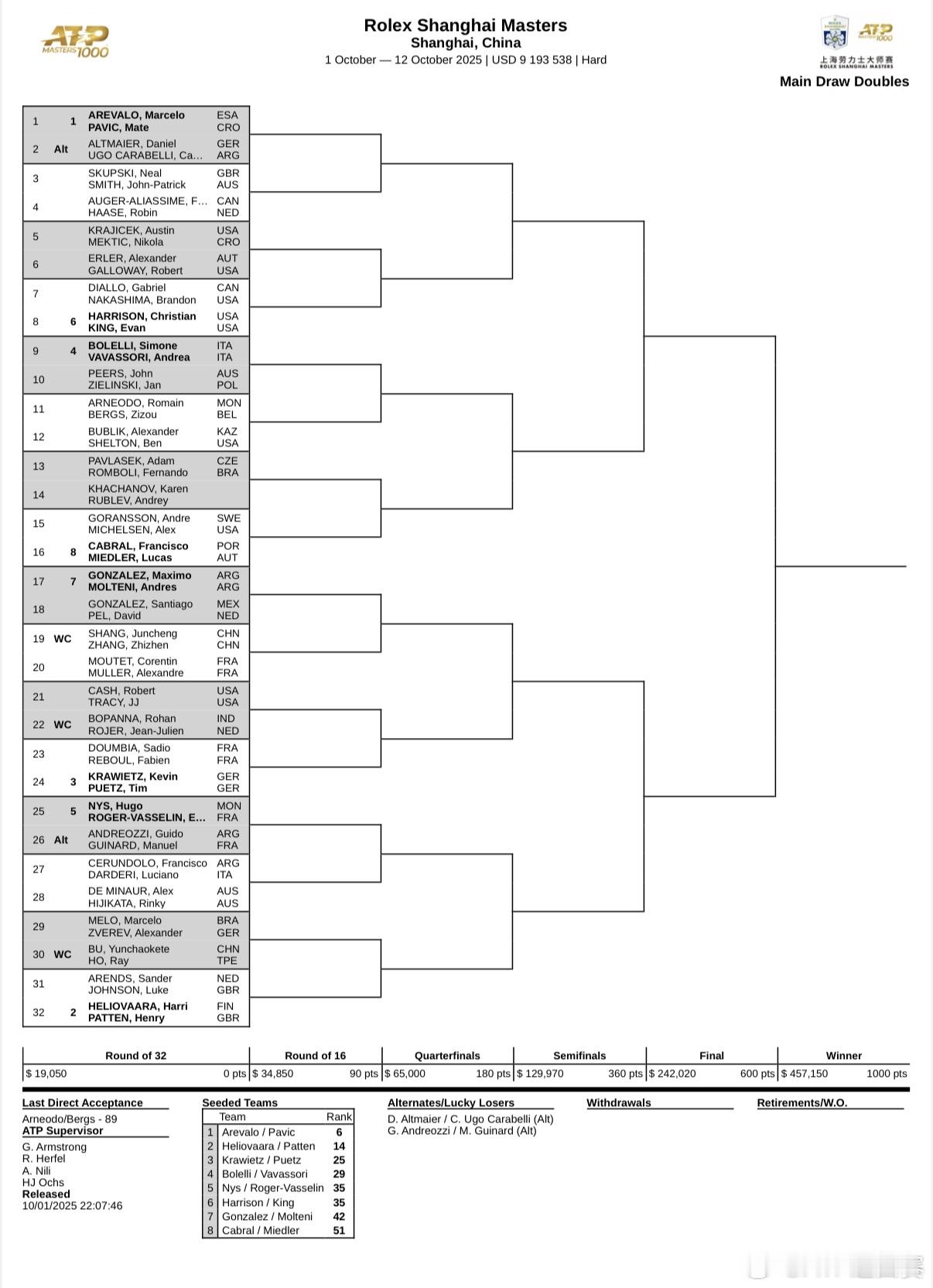 商竣程/张之臻首轮将对阵法国组合穆泰/A·穆勒,布云朝克特/何承叡首轮将对阵梅罗/兹维列夫。