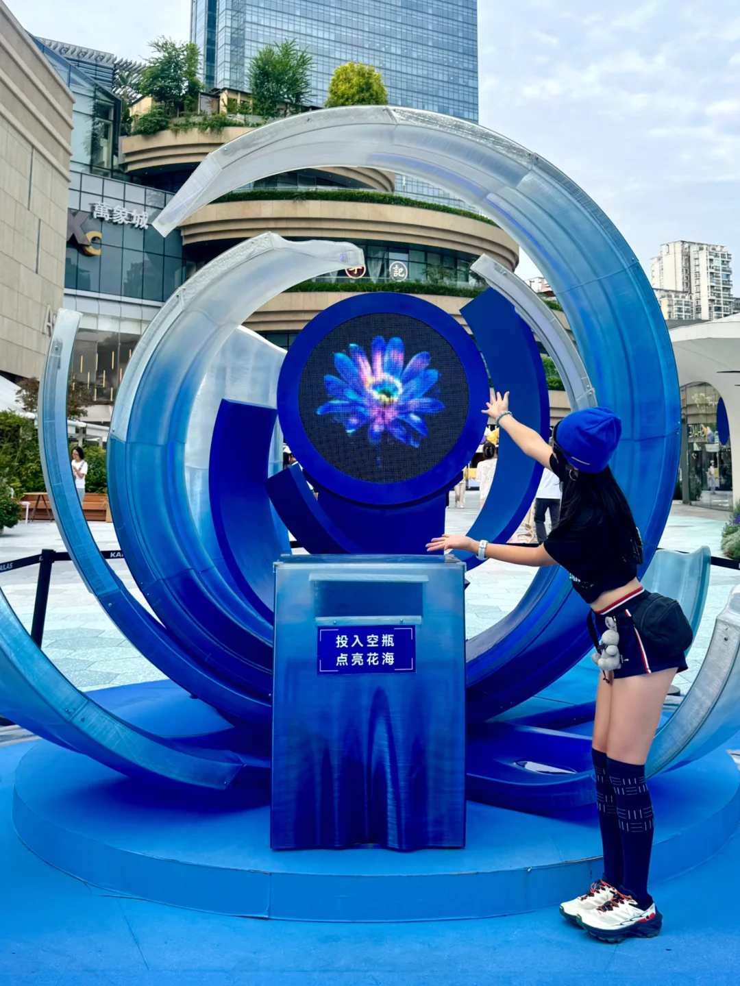 展览现场还能打卡”冰川之花"环保装置,投入塑料瓶就能开一次花
