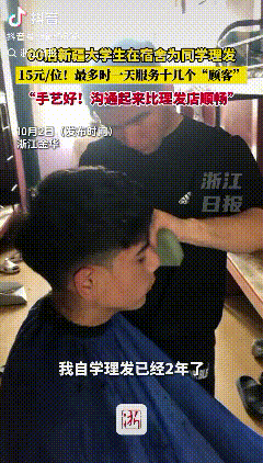 有头脑!浙江金华,00后新疆大学生自学理发,直接在宿舍给大家理发,价格便宜,顾客对他评价也不错。 据浙江日报报道,10月2日浙江金华,一位00后新疆大学生自学理发两年,流行发型都会剪,15元每位,最多一天服务过十几个顾客,剪过的顾客对他评价“手艺很不错,沟通起来比理发店更顺畅,还是大学生更懂大学生”。 自学理发2年流行发型都会剪,还直接在宿舍“开理发店”,顾客对其评价也是不错,由此可见男子不仅有理发的天赋,而且还很有商业头脑。 自学理发不仅学会了一门手艺,而且还可以赚钱,这样可以为家里省下不少的负担。 直接在宿舍都能理发,而且便宜还方便,沟通起来也简单,这“理发店”开的可谓是占尽了优势。 世上无难事,只要肯登攀,只要用心去钻研去学习,不怕学不好。