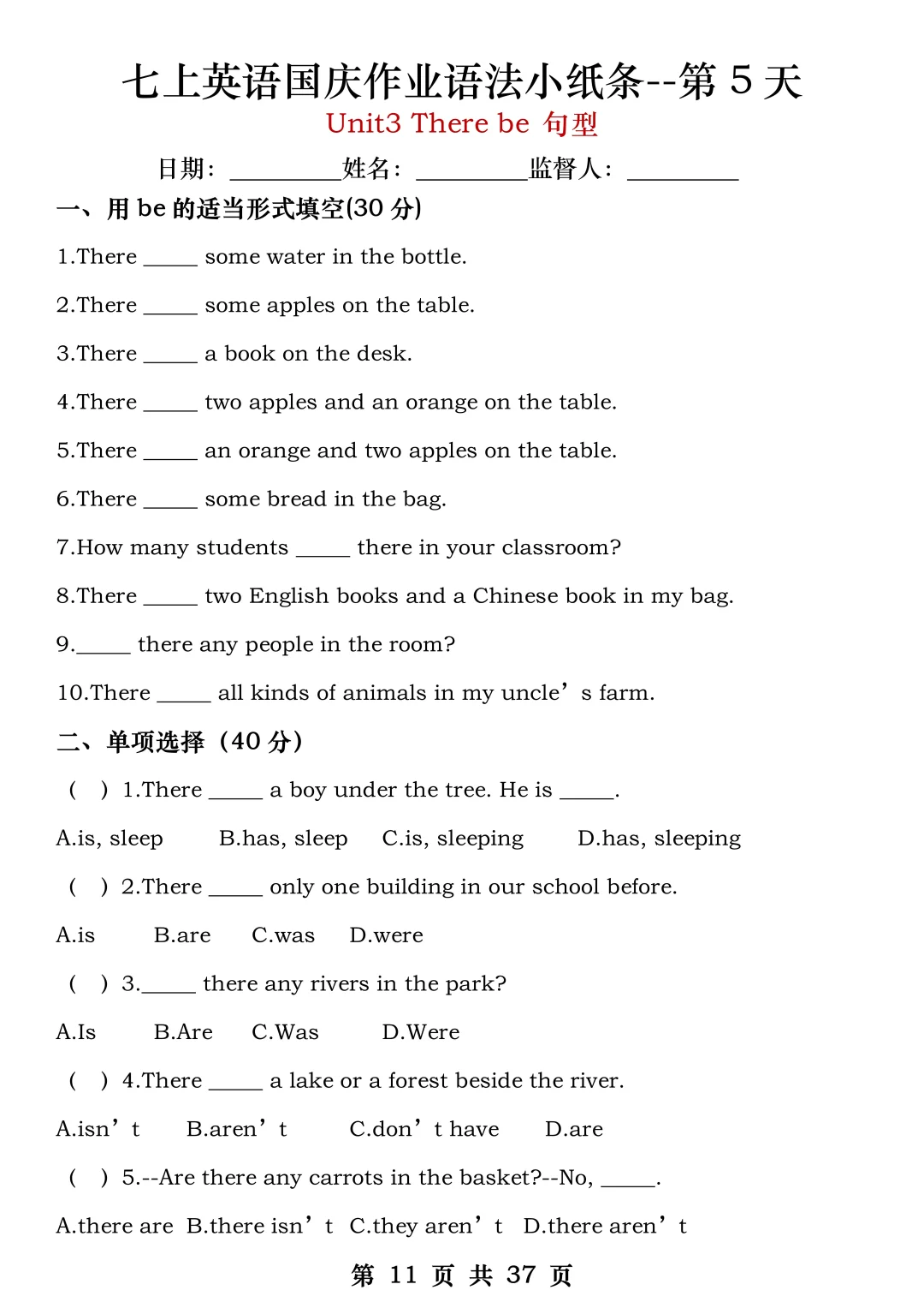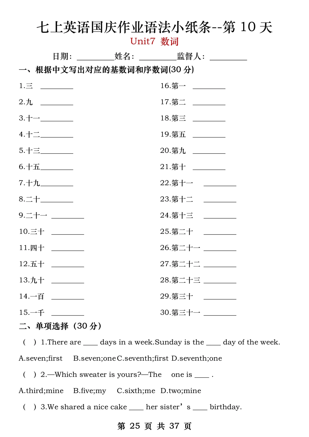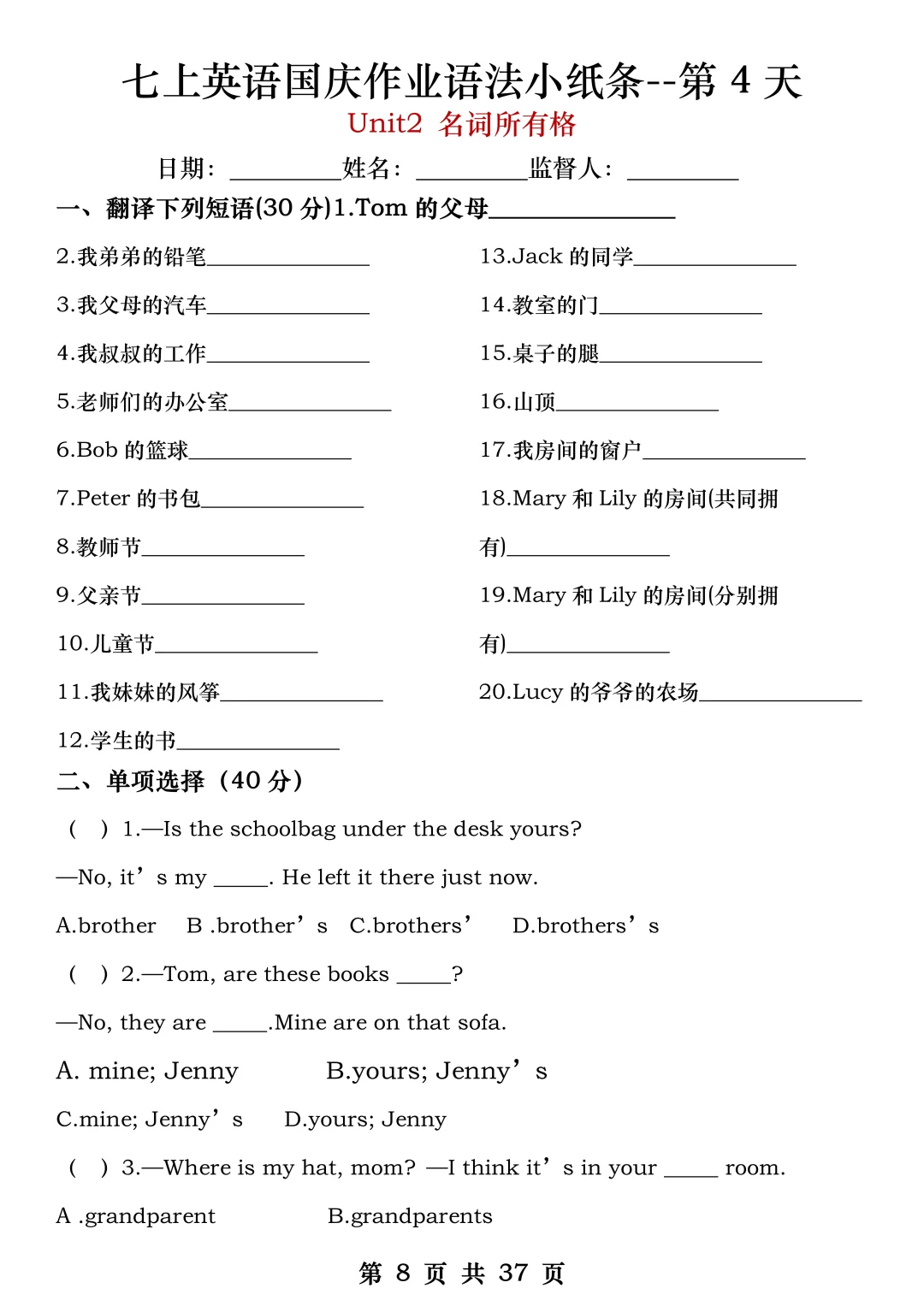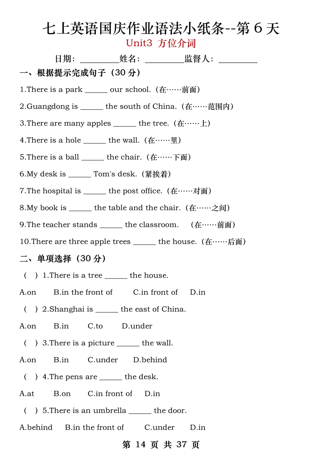 火箭班老师发的:七上英语国庆作业练小纸条