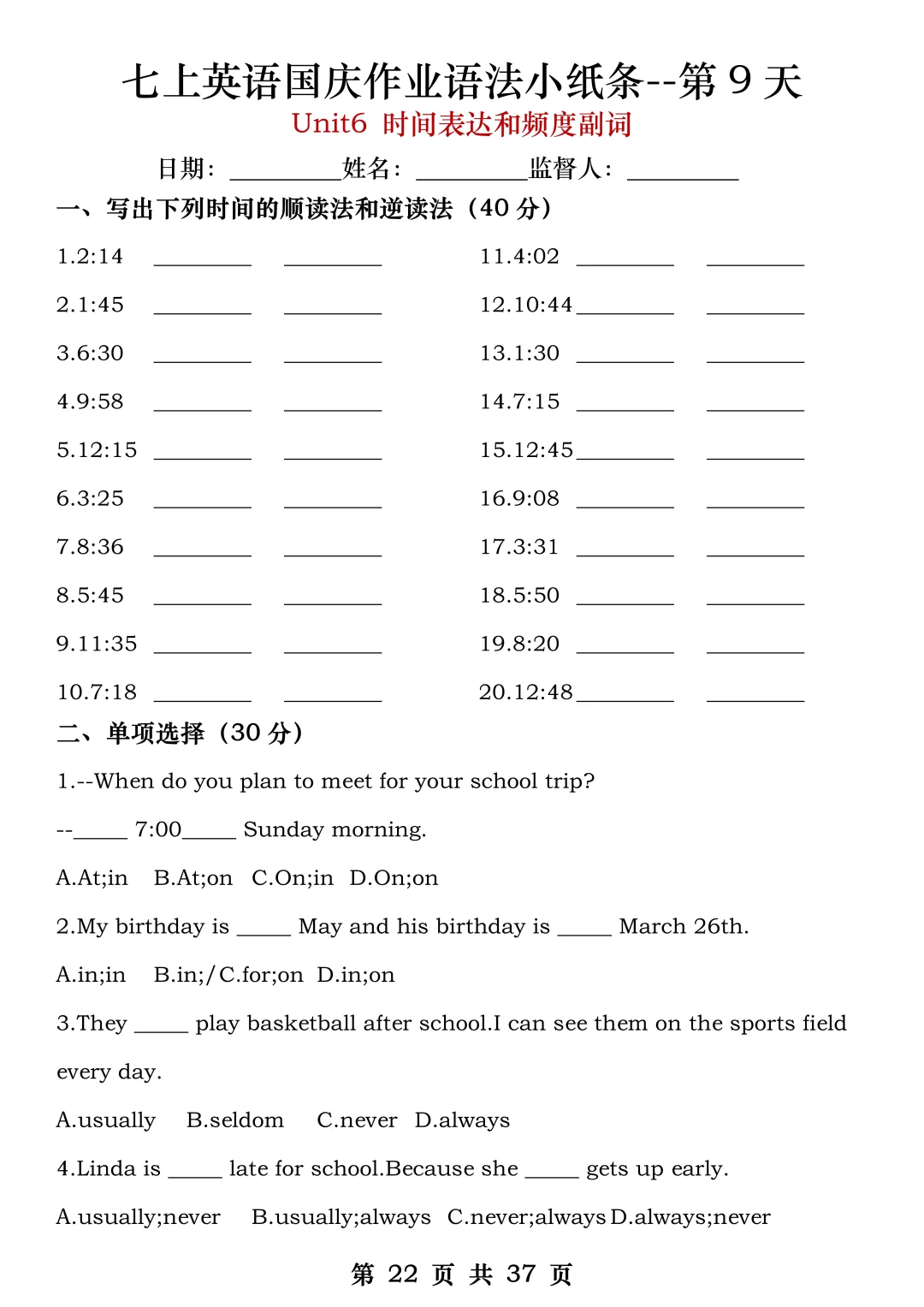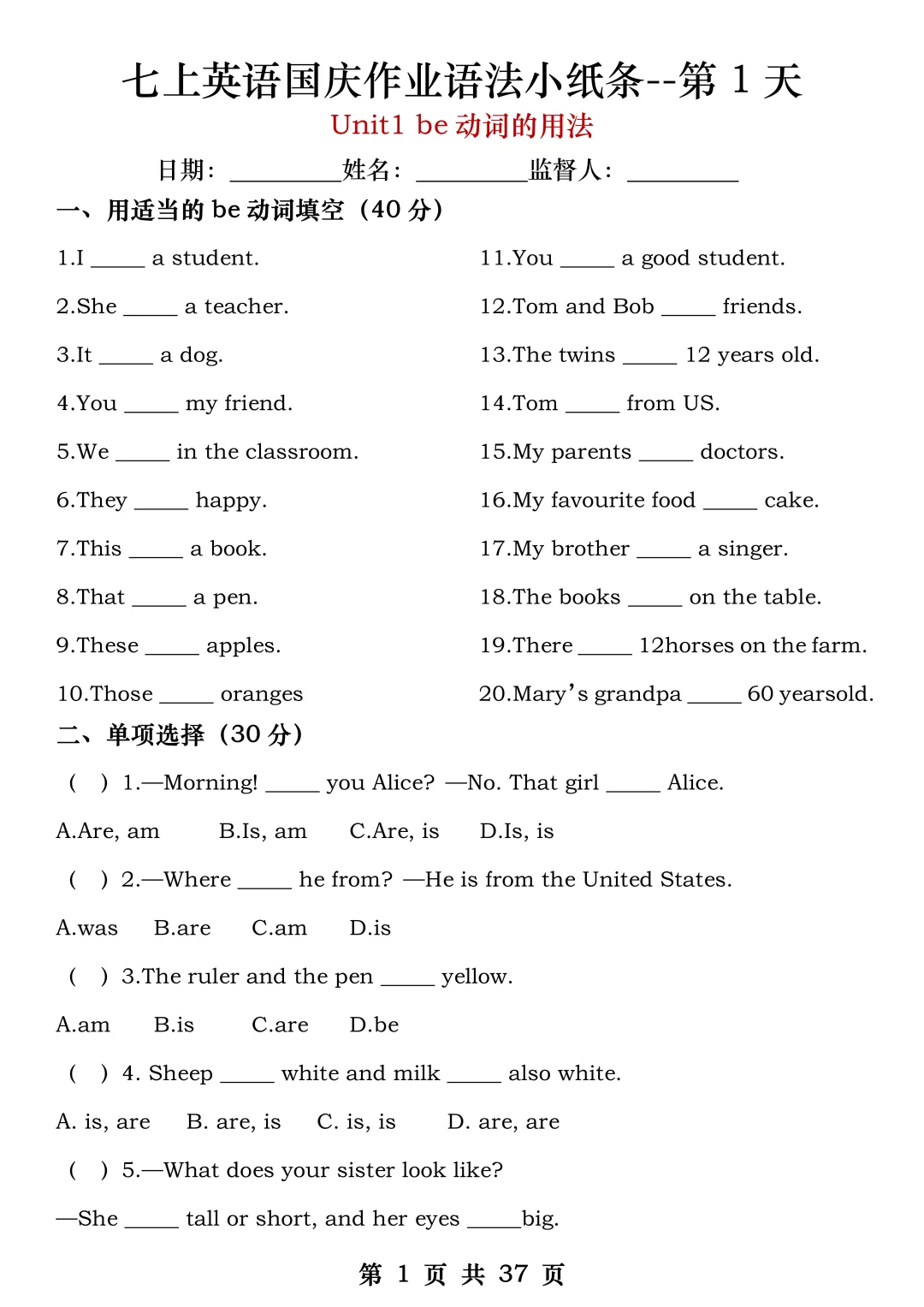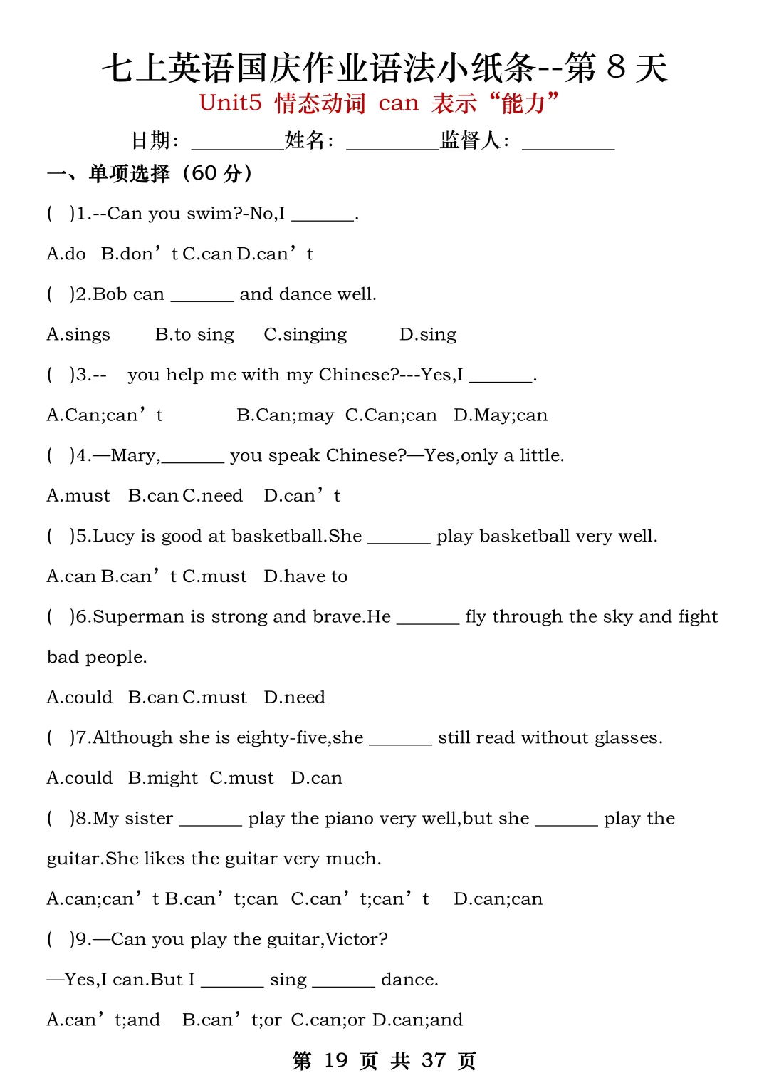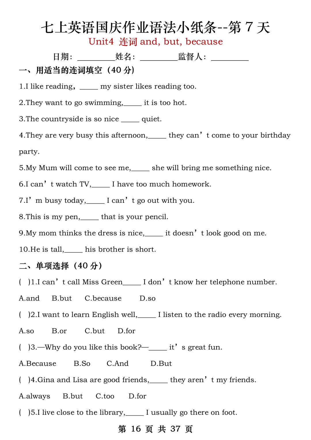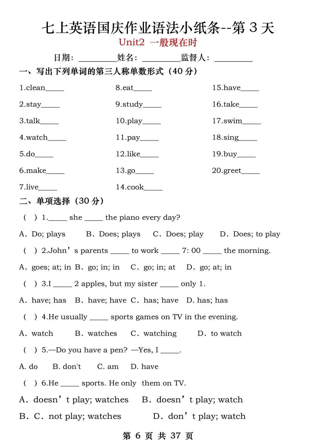 火箭班老师发的:七上英语国庆作业练小纸条