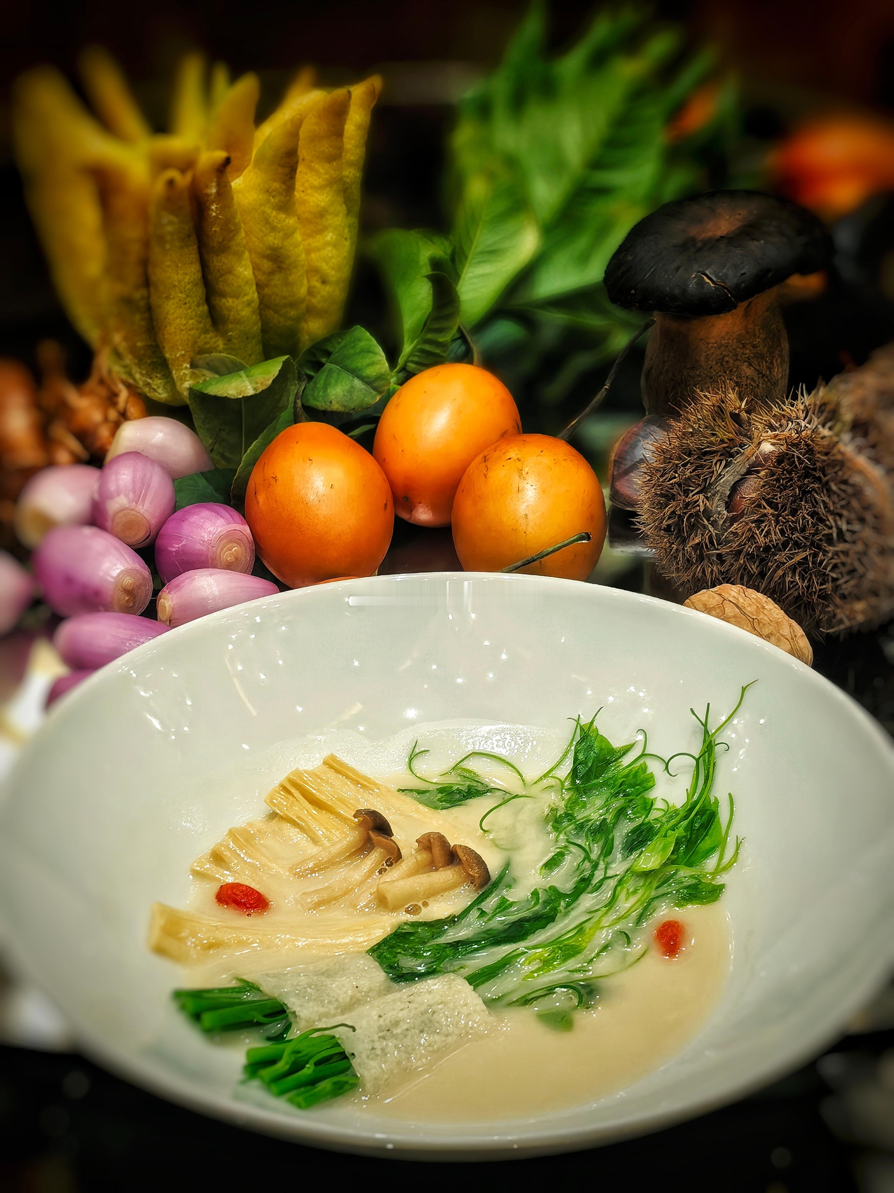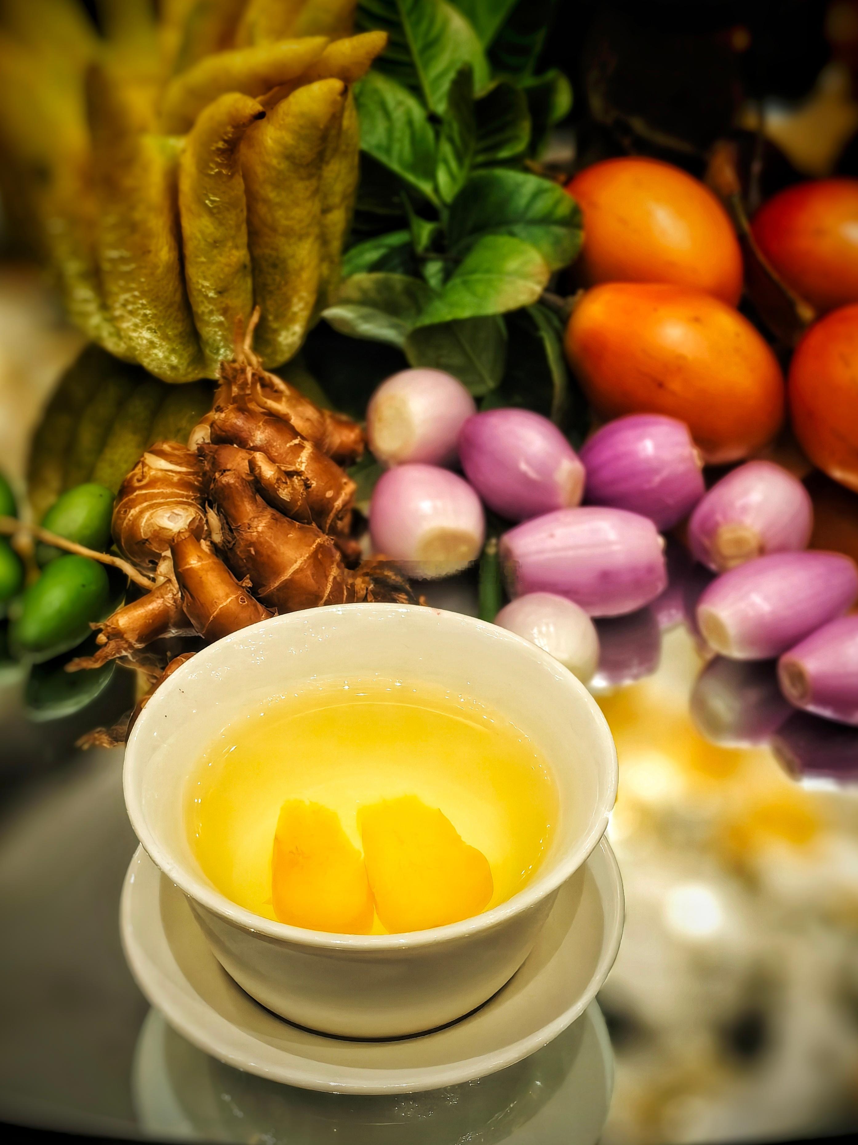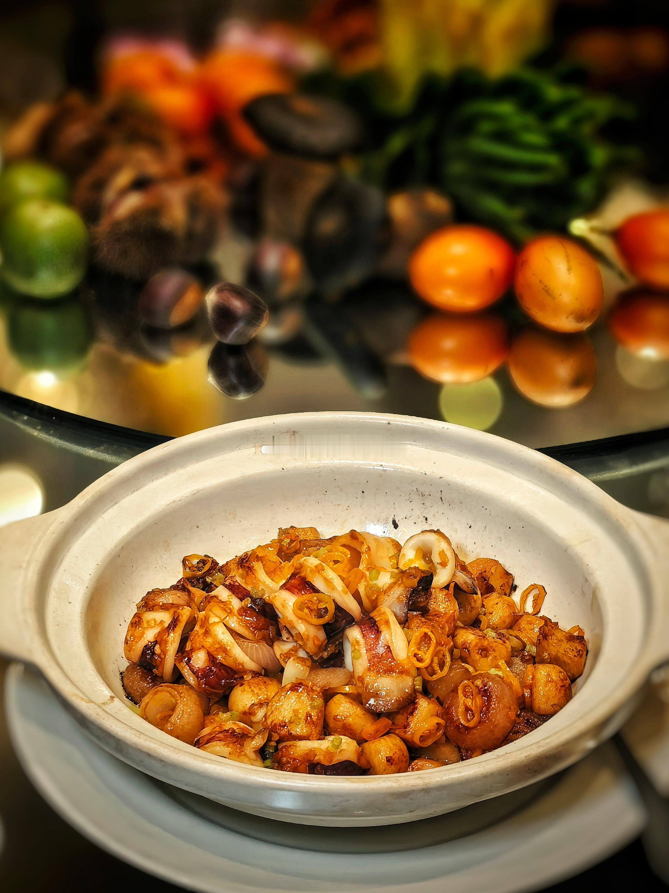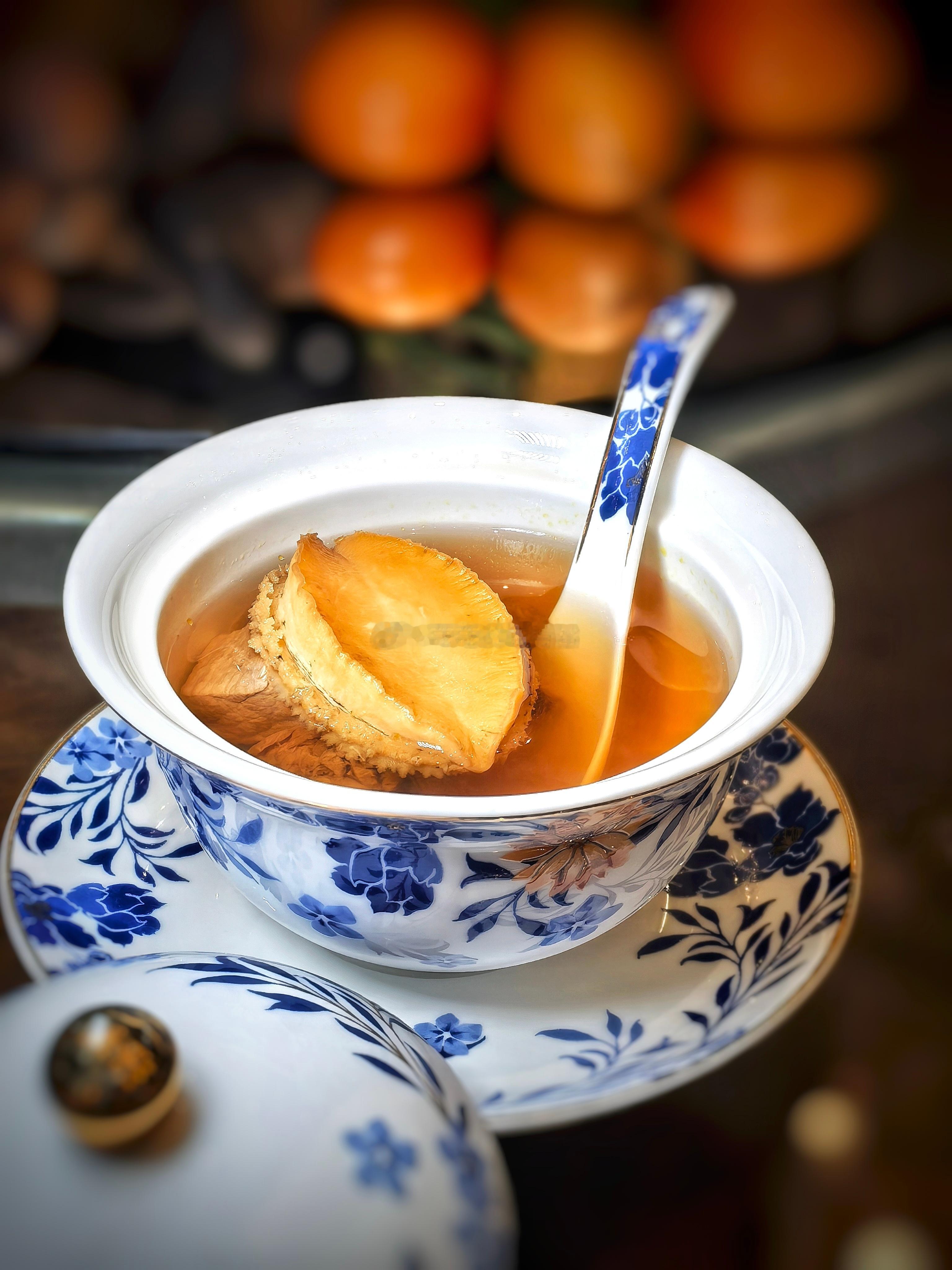 “老香黄青橄榄鲜鲍炖岭南鸡”,花足足十个钟的功夫,汤色清莹汤味清鲜又圆润,汤里薄薄几片分量精妙把握的五年陈老香黄,让汤品充满明亮气质,妥帖舒坦。
