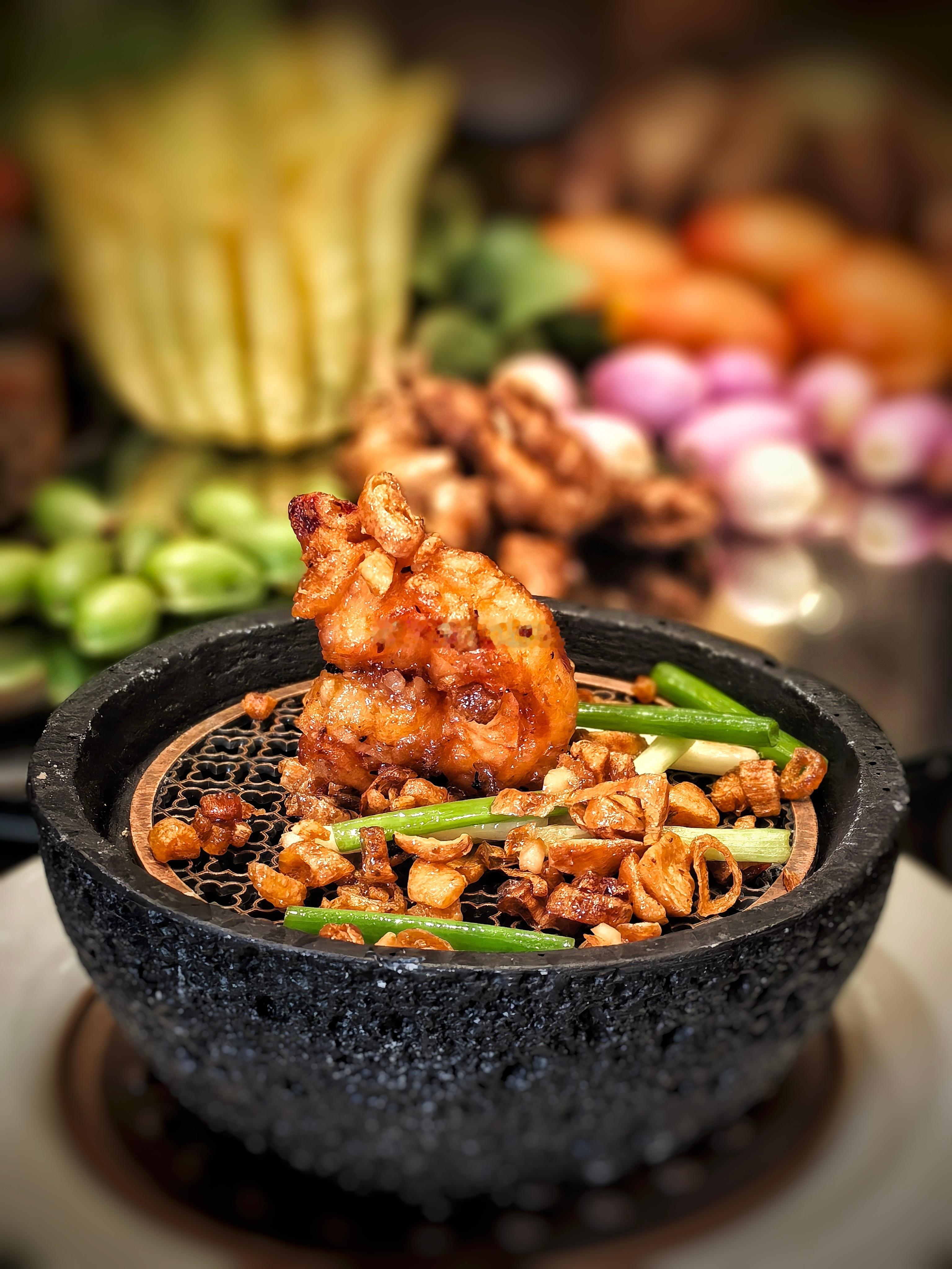 “”鲜沙姜红葱酥焗黑虎虾”是彰显粤菜巧思的灵感之作,粤地特有的鲜沙姜、红葱头,经过烹炸褪去辛辣转为焦香酥脆,与硕大弹牙又鲜甜的黑虎虾相得益彰,下酒,实在是下酒。