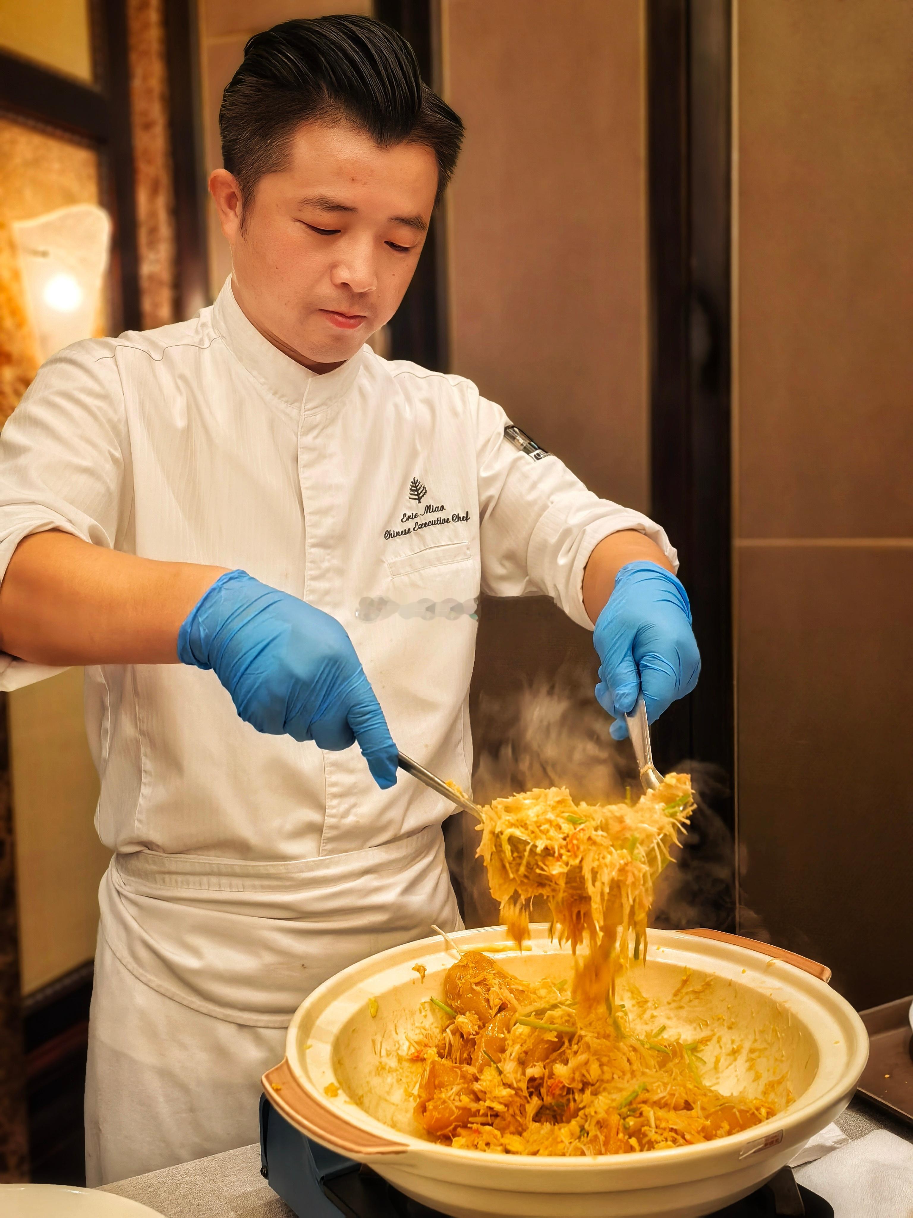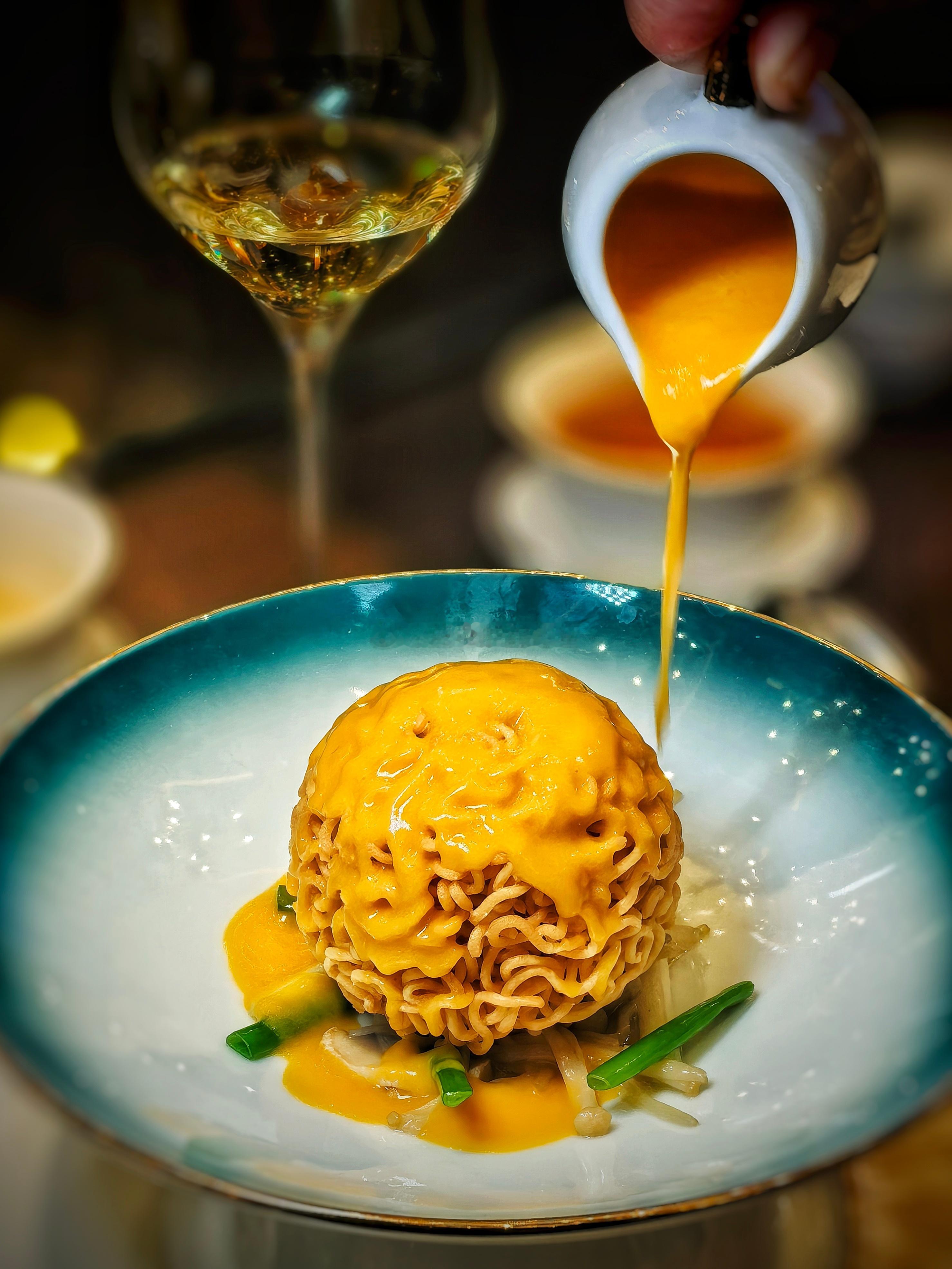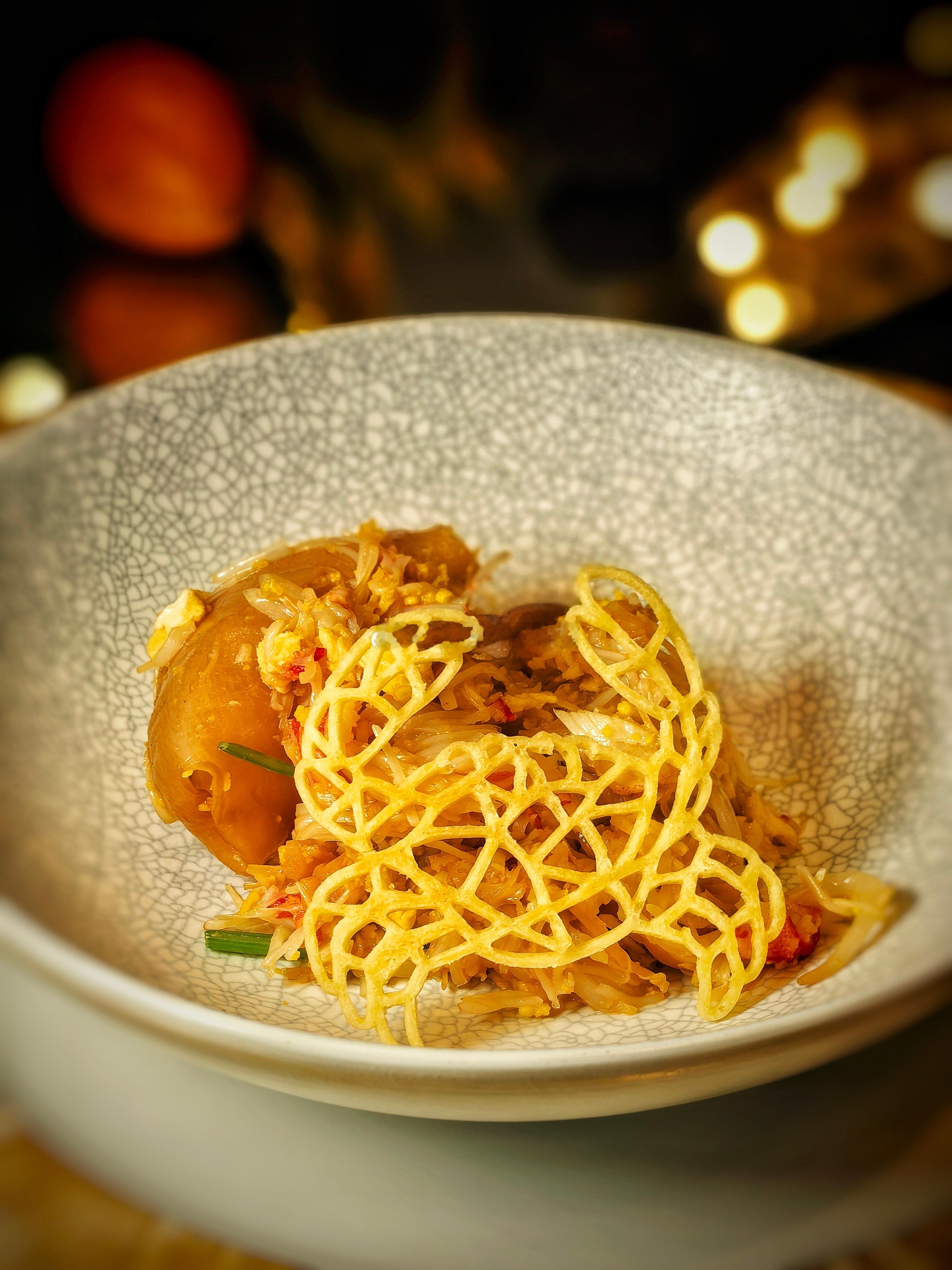 “蟹黄汤玲珑蛋仔面”有巧思,苗师傅将蛋仔面做成中空新绣球形状炸得金黄酥脆,当位淋上浓稠汤汁,卖相唻得额嗲。敲碎后的蛋仔面,吃原味已然香脆讨喜,泡过汤汁又有“两面黄”的神韵。感觉这道主食将来还有更多组合与味型的可能性呈现,必成招牌。