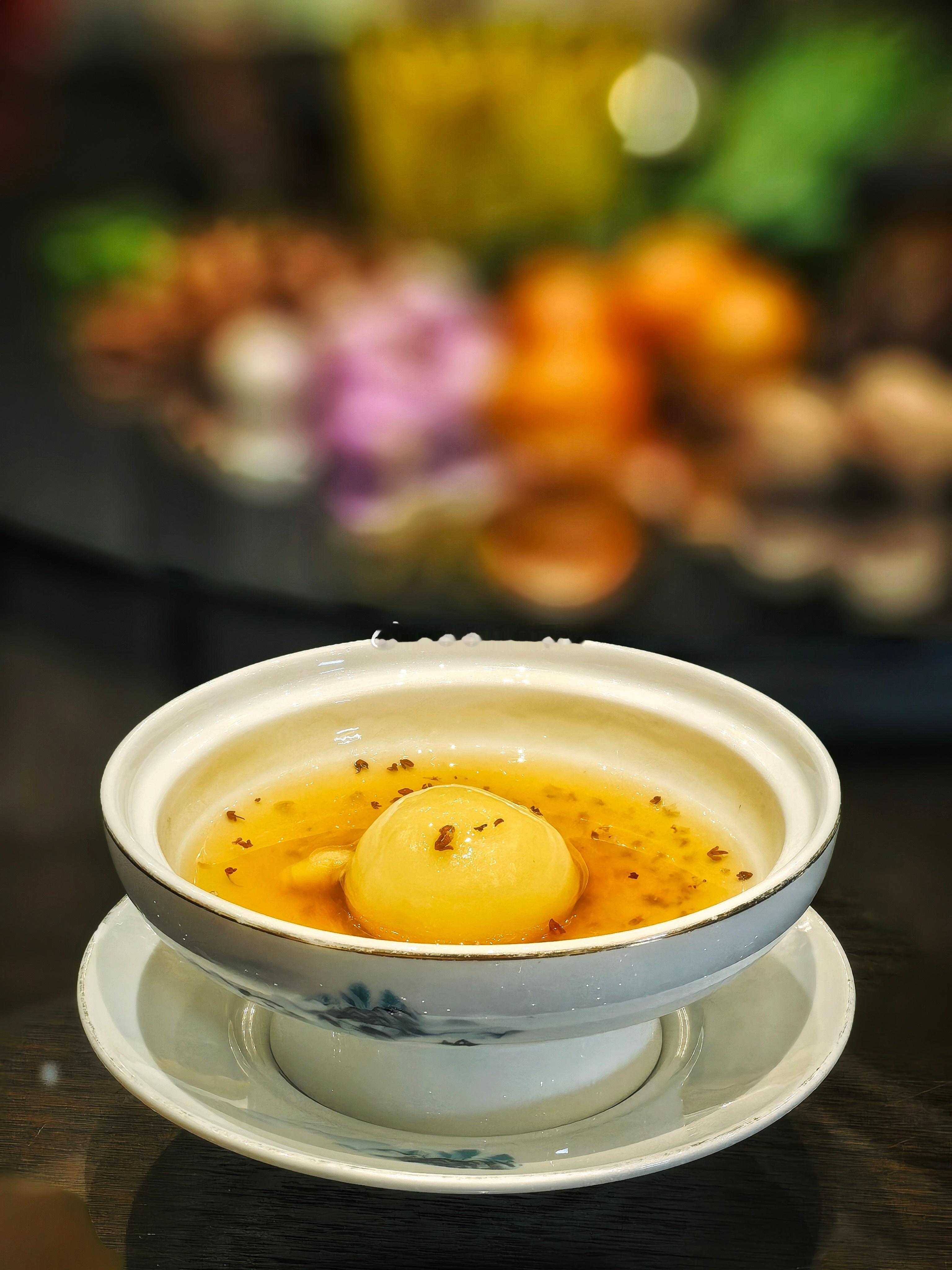 甜品里“金桔桂花凝露银杏燕窝汤圆”,将银杏磨成粉混入少少南瓜粉再与糯米粉揉成汤圆皮,雅致的银杏香与明亮的金桔香甜美的桂花香挽手共舞,是美好明媚天津秋天的味道呀!