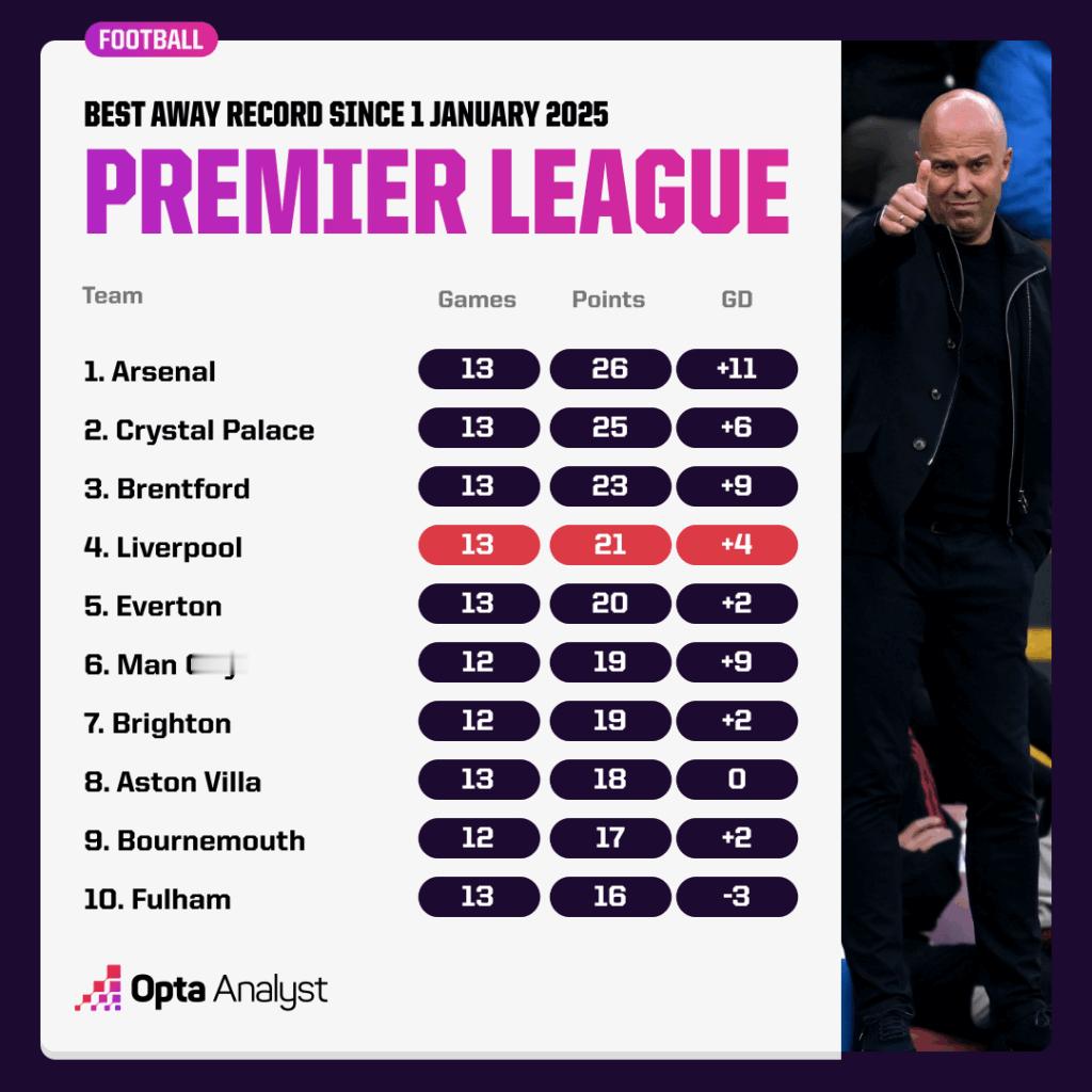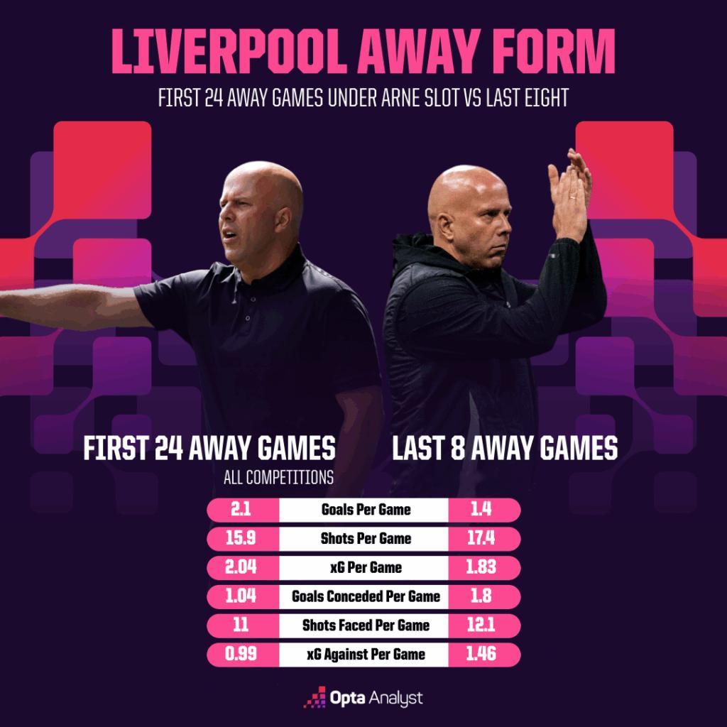在2024-25赛季开始到2025年1月1日期间,斯洛特执教的利物浦在各项赛事中进行了14场客场比赛。他们取得了非常出色的成绩,12胜2平0负,场均进2.6球(预期进球2.4),失1.1球(预期失球1.0),射门转化率为15.9%。
