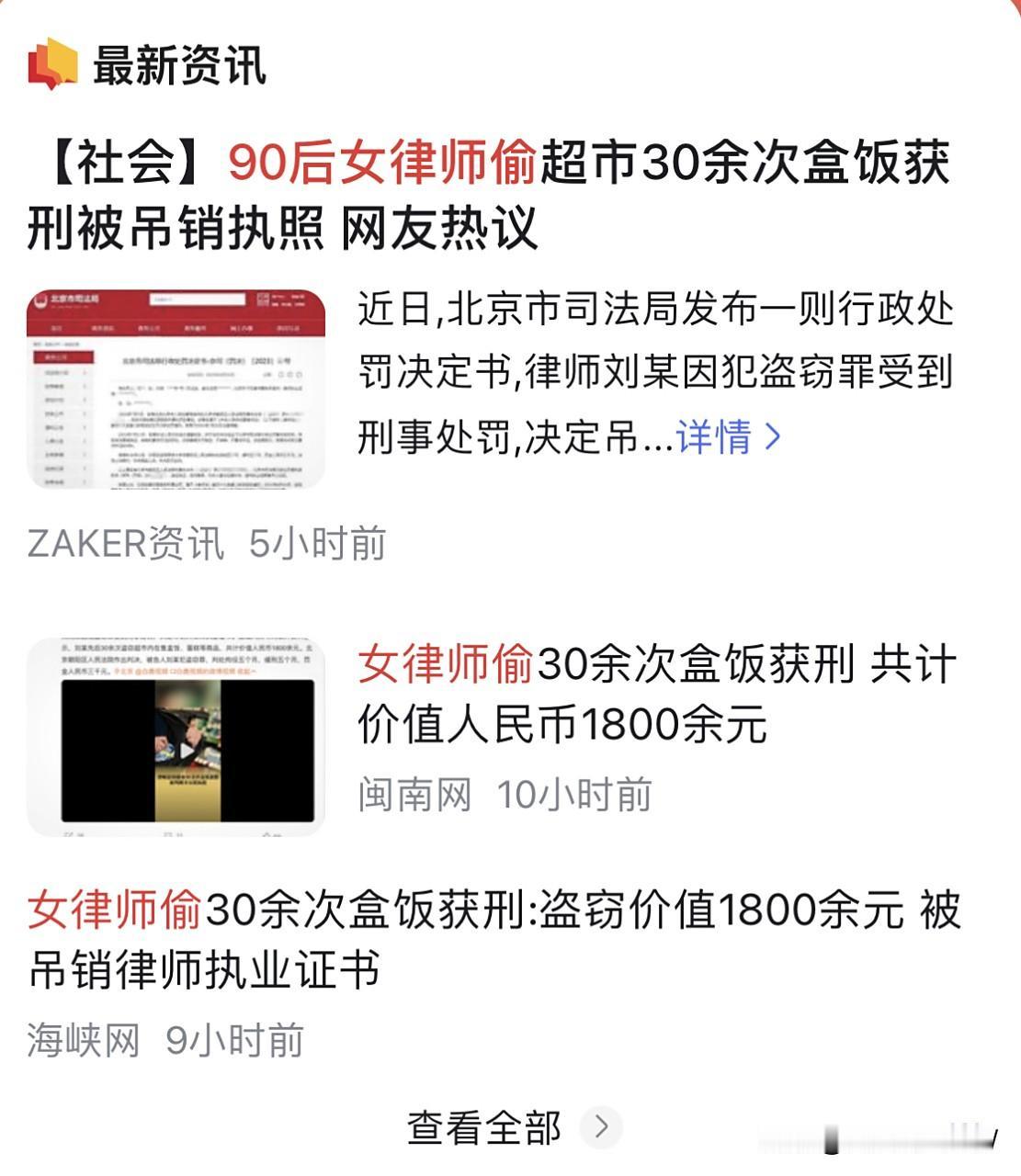 90后女律师的职业生涯为何葬送在自助超市? 发生在北京的这个真实事件,彻底毁灭了一个90后女律师的职业生涯。北京某女律师,到超市自助结账时漏扫商品30次,被判刑了。 自助超市,工作人员少,顾客自己扫码结账,漏扫商品是常有的事。这位女律师经常性漏扫。总共漏扫了30多次总共价值1800多元。 可是这样的事不是抱着侥幸的心理去做迟早有一天会被发现。店员发现店里营业额和商品不匹配于是报了警。 警方根据线索,很快锁定了她,并将其抓获。法院审理认为:被告人刘某在超市购物时,未支付全部商品款项,且其行为数额较大,对商场造成了损失,情节严重,构成盗窃罪。 最终法院判决:拘役5个月,缓刑5个月,并处罚金3000元。 她的律师资格被吊销,因为犯罪不得继续从业。 因为这位女律师贪小便宜的作为,不仅把自己的送进去了看守所还把自己的律师资格证吊销了,真的得不偿失,而且她在律师行业已经走到了尽头。