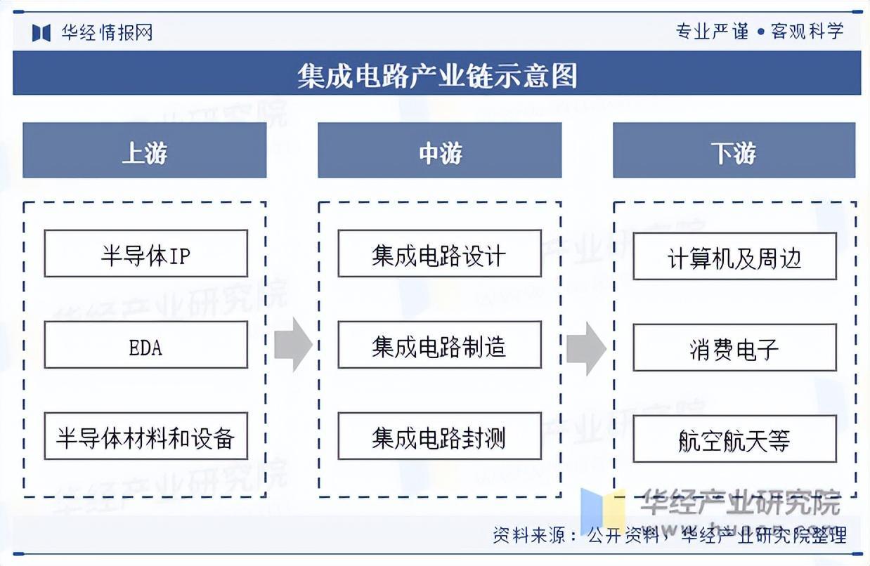 集成电路产业链上游为材料、设备厂商,主要负责提供制造芯片所需要的原材料,EDA与IP工具作为IC设计的软件工具,是集成电路产业的基石。中游则包括集成电路的设计、制造和封测;下游为终端应用厂商,如消费类计算机、手机等厂商,航空航天类的SOC芯片等,广泛应用于生活中每个环节。