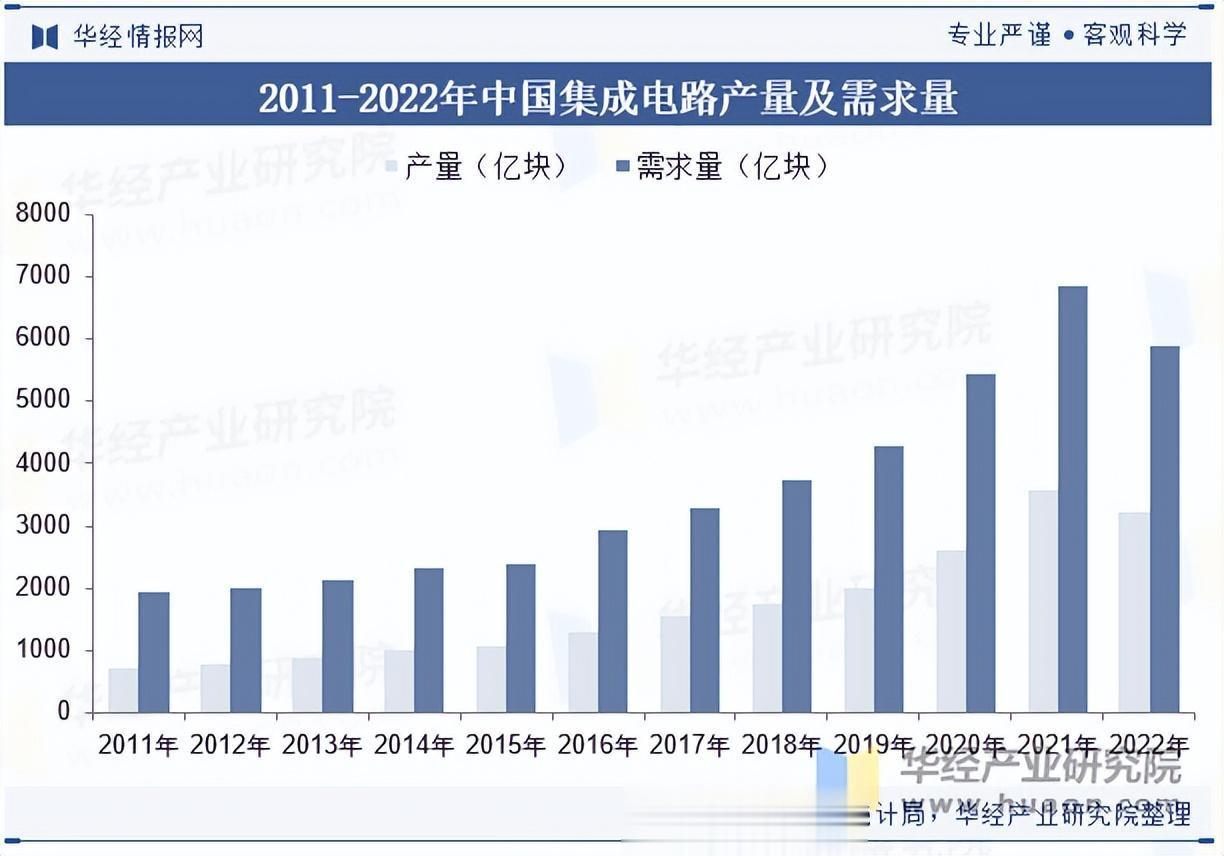根据国家统计局数据,国内集成电路行业总生产量从2011年的719.52亿块上升到2021年的3594.3亿块,年均复合增长率约为17.45%。受疫情等因素影响,2022年中国集成电路产量下滑至3241.9亿块,同比下降9.8%,集成电路需求量减少至5892.3亿块,同比下降1.88%。伴随着疫后复工复产以及经济整体复苏,中国集成电路产量及需求量有望恢复增长态势。