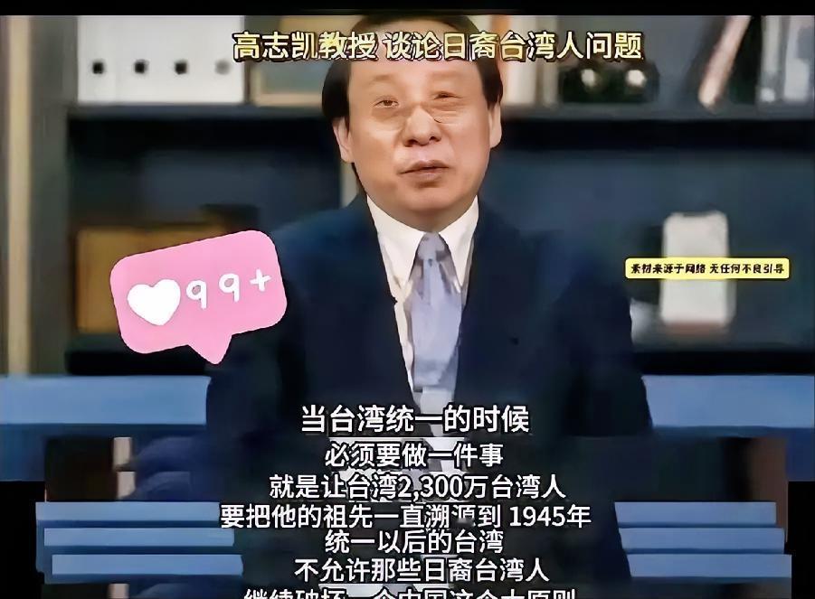 高志凯提议对台湾同胞溯源! 高志凯先生日前又有新提议,台湾统一后,对2300万台湾同胞要进行溯源,一直统计到1945年。 这话初听有点懵,1945年是什么节点?那是台湾光复的年份,《开罗宣言》白纸黑字把台湾还给中国的年份 。用“溯源”这个词套在同胞身上,总觉得硌得慌——难道两岸同根的事实,还需要一张统计表来证明? 高志凯先生履历够硬,给邓公当过翻译,在智库里专研战略,但这次提议明显跑偏了。他或许是想借鉴1946年遣返日侨的经验,可当年留台的日本人最多不过两万多,如今却要对着2300万同胞搞统计,这尺度差得太远。 李登辉这类亲日分裂分子确实该清算,但那是少数人的恶行。台湾“中央研究院”的研究早说了,岛上大姓族谱全写着“祖籍光州固始”,我认识的台北朋友家里,供桌还摆着福建迁台的祖先牌位。这用得着溯源吗?血脉早把答案刻在骨子里了。 民调数据更能说明问题:87.3%的台湾民众认同自己是中华民族一份子 。他们听的是周杰伦的《青花瓷》,过的是春节端午,连抖音上的大陆热梗都能随口接。这些日常里的文化认同,比任何溯源表格都有力。 统一的核心是什么?厦门大学的郑剑教授说得透彻,是“心灵契合”。要是真搞全民溯源,反而会让民进党抓住把柄,炒作“大陆不信任台湾人”,这不是帮倒忙吗?马英九的智囊赵春山都提醒,要警惕“去中国化”弱化精神纽带,现在倒好,自己先竖起了隔阂的墙。 1945年的意义,是宣告台湾重新纳入中国版图的法理终点,不是划分同胞身份的起点。那些拿《波茨坦公告》当依据的人该清楚,台湾同胞的中国身份,从来不需要“追溯确认”,这是抗战胜利早就定下来的结果。 真正该做的,是像大陆给台湾同胞发居住证那样,用实实在在的便利拉近距离。而不是搞这种看似严谨、实则伤感情的形式主义——分裂分子藏在暗处,普通同胞却要被“溯源”惊扰,这账算得太糊涂。 统一从来不是“查户口”,是让两岸人重新坐回一张桌前,聊共同的祖先,说共同的语言。用“溯源”把同胞当“外人”提防,恰恰违背了统一的本意。 各位读者你们怎么看?欢迎在评论区讨论。