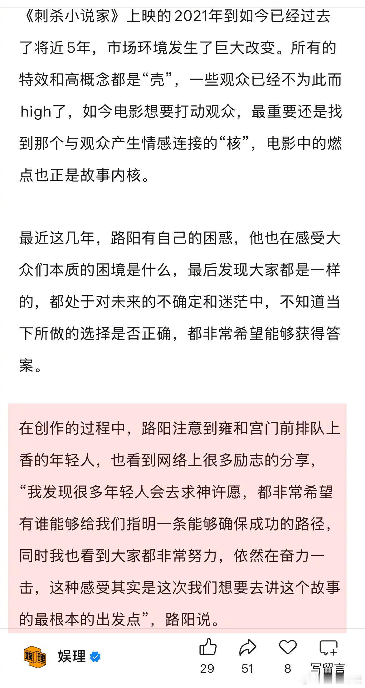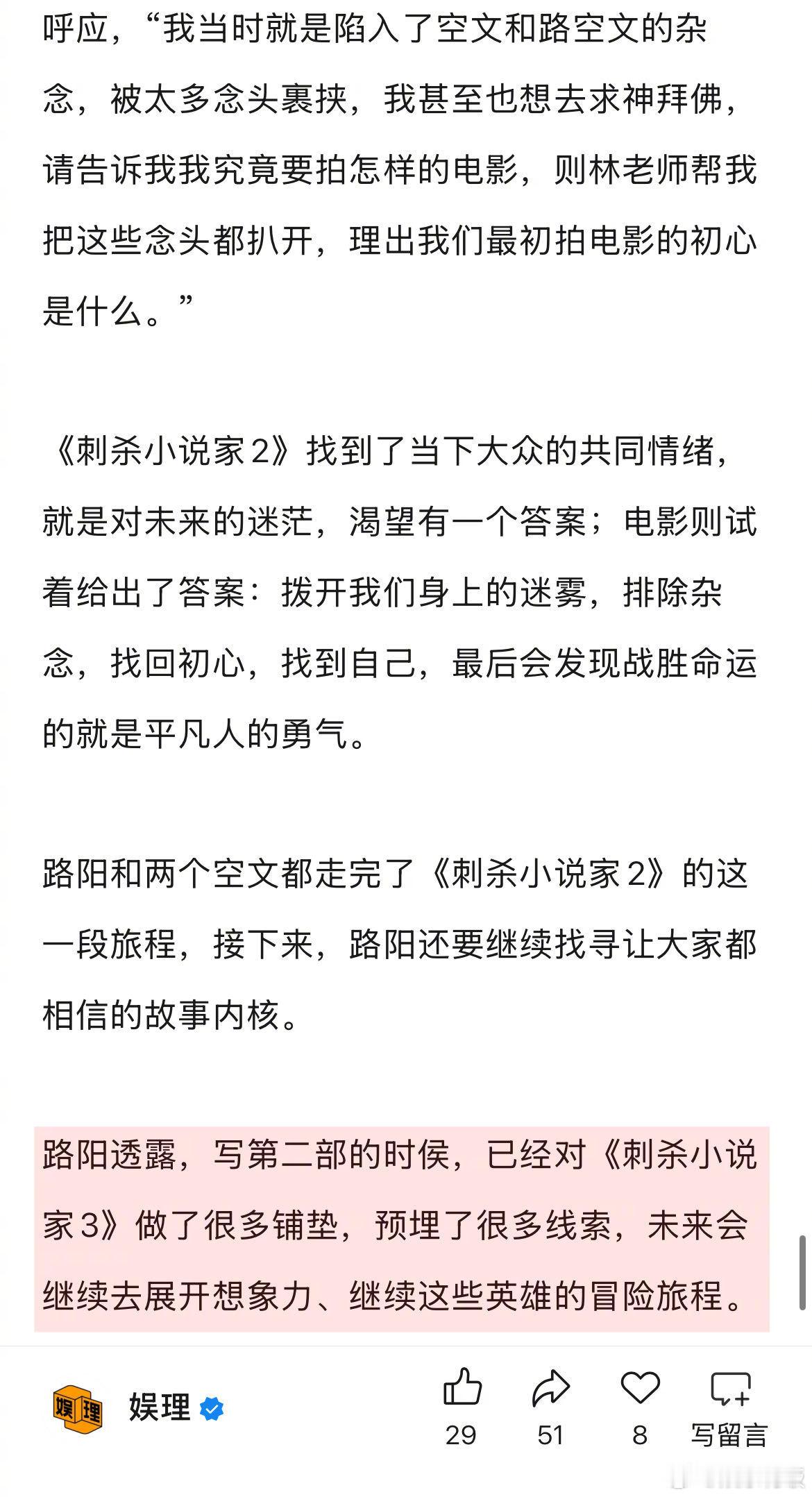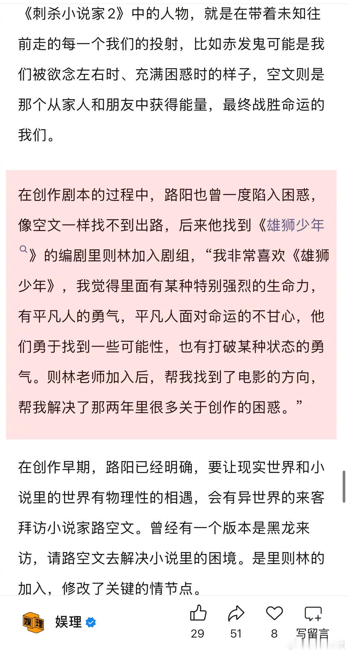 路阳赞丁程鑫表演超出预期路阳透露刺杀小说家3进度 创作《刺杀小说家2》剧本时,导演路阳也曾一度陷入困惑,后来他找到《雄狮少年》的编剧里则林加入剧组,“我非常喜欢《雄狮少年》,我觉得里面有某种特别强烈的生命力,有平凡人的勇气,平凡人面对命运的不甘心,他们勇于找到一些可能性,也有打破某种状态的勇气…”娱理独家↓