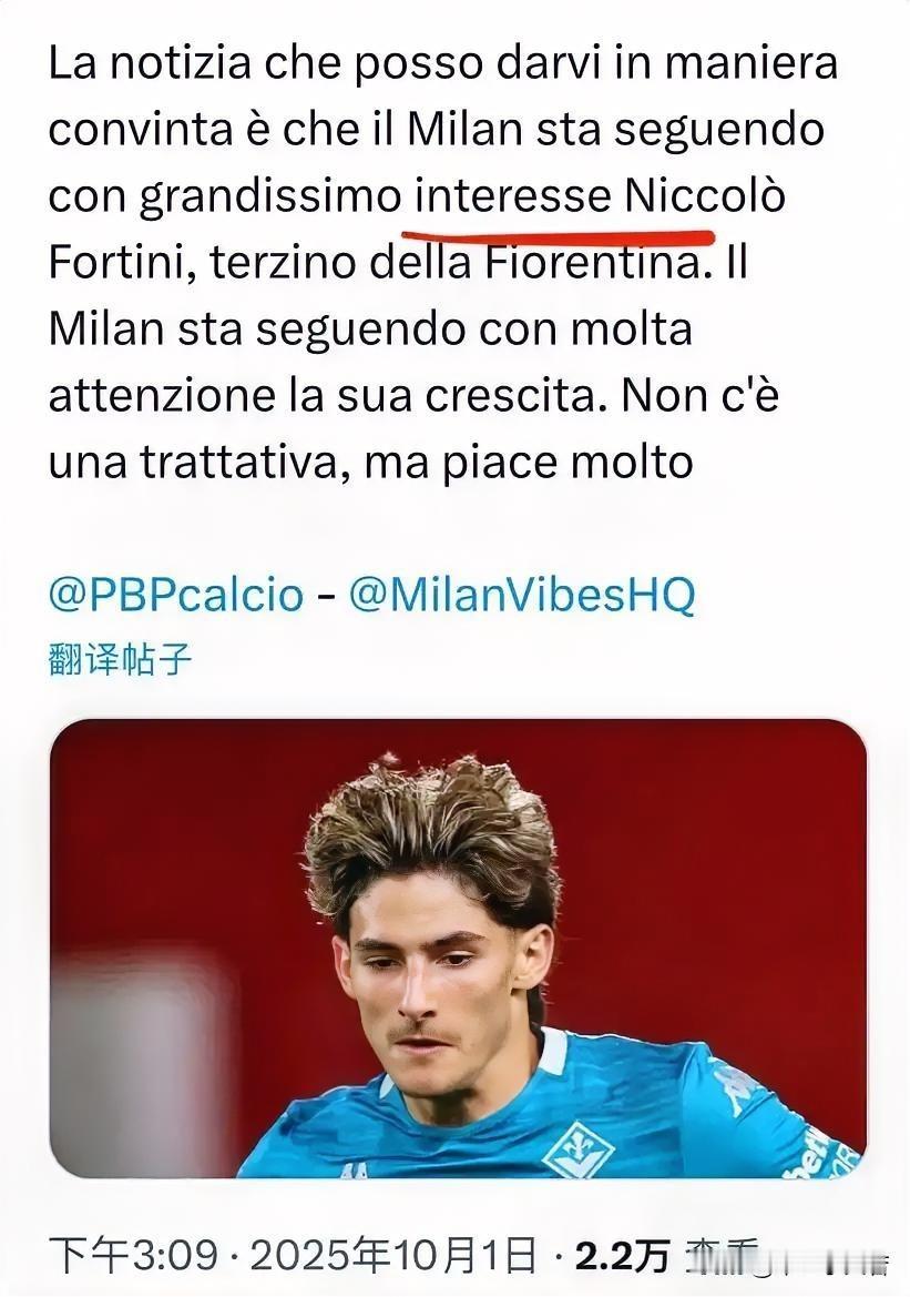 尼科洛·福蒂尼!米兰正在密切关注佛罗伦萨边后卫尼科洛·福蒂尼,AC米兰正在密切关
