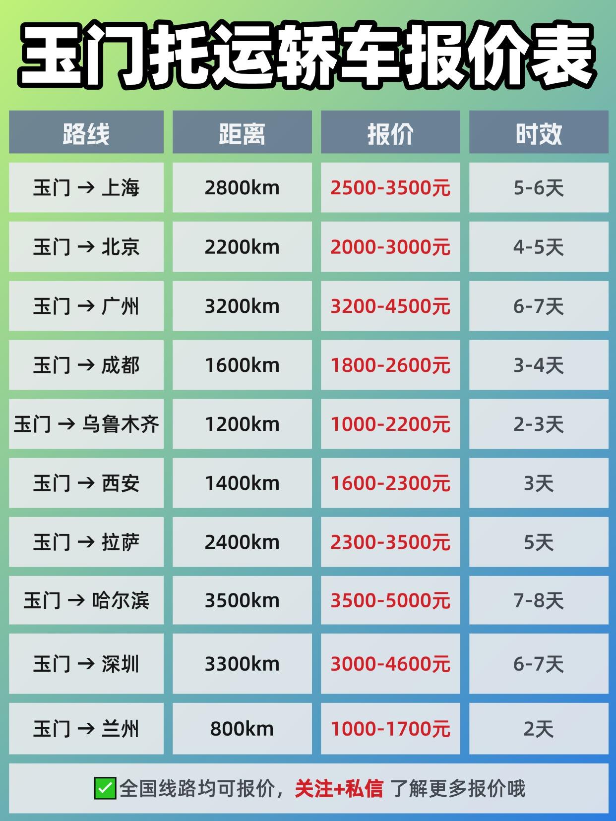 玉门发车全国报价 & 时效 报价区间:1500元~5500元(具体看路线+车型) 时效参考:3~8天(跨省越远时间越长) Tips:SUV/豪车需加200-800元!旺季(如节假日)价格涨10%-20%! 托运必看Q&A Q1:车里东西丢了怎么办? ⚠️ 重点! 托运公司不赔车内物品! ✅ 自救指南: ① 发车前清空私人物品(尤其贵重品!); ② 如必须放,拍照留证+签协议写明物品清单; ③ 丢件立即联系物流,报警并索赔(有证据成功率↑) Q2:车到目的地会洗车吗? 🙅 一般不洗! 长途运输灰大,到手车可能"风尘仆仆"。 ✨ 加钱可升级:部分公司提供付费清洗(约50-100元),下单前记得问清楚!