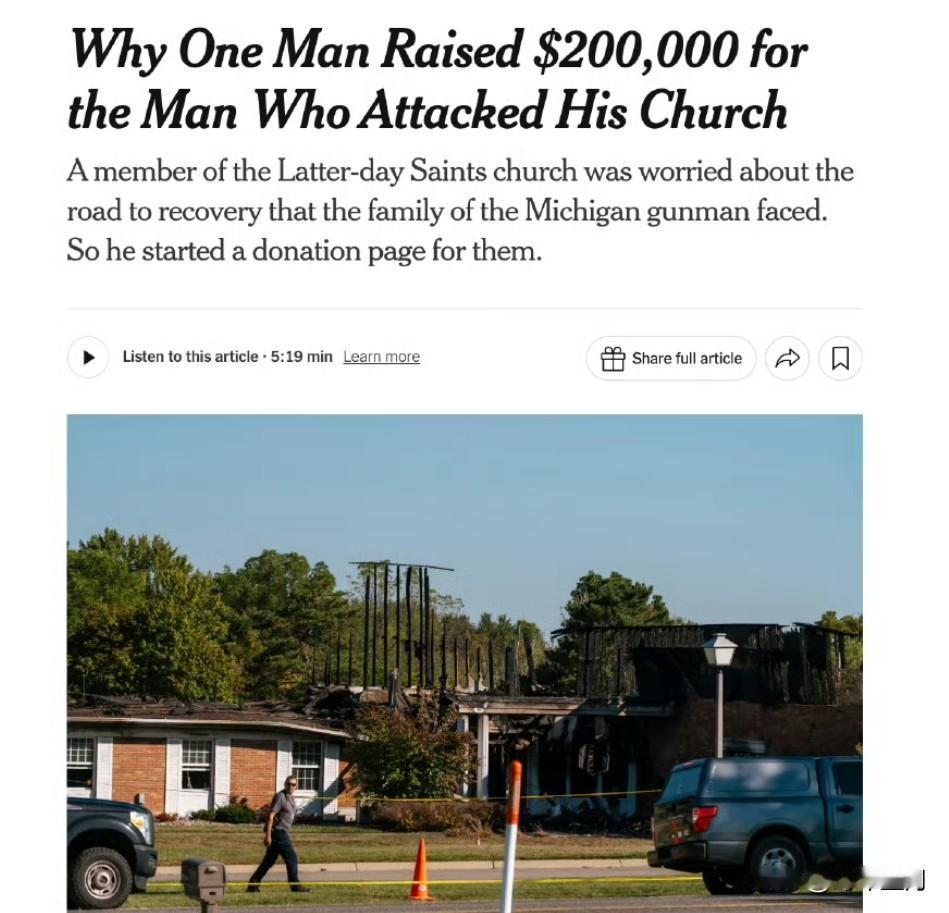 密歇根教会枪击案发生后,有人为凶手家人发起募捐,已经筹集超20万美元 密歇根州一所摩门教会发生致命枪击后,当地与全美各地民众迅速发起捐助,不仅支持遇难与伤者家庭,也在作家兼教会成员戴夫·巴特勒的倡议下为嫌疑人托马斯·雅各布·桑福德的妻儿筹得超20万美元。 据称此举源于宗教信念中的“与哀恸者同哀”“宽恕与怜悯”,引发广泛共鸣与少量质疑,同时凸显社交平台上对施害者家属公开表达同情的相对新趋势。心理学者指出,宗教社群的组织化价值观强化了怜悯与宽恕的动员力,而不少捐助者也在行动中寻得情绪纾解与道德实践的路径。 为枪手家人募款页面上线即获快速响应,两小时筹得7000美元、12小时近10万美元,现已超过20万美元、逾5000名捐款人参与。