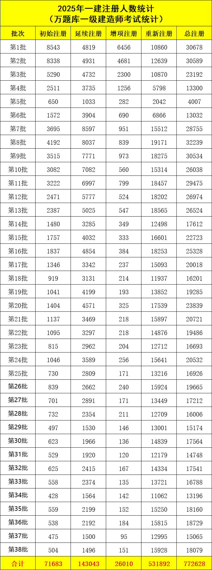 2025年截止目前,住建部已公布1-38批次注册名单,总注册人数为772628,具体如下: