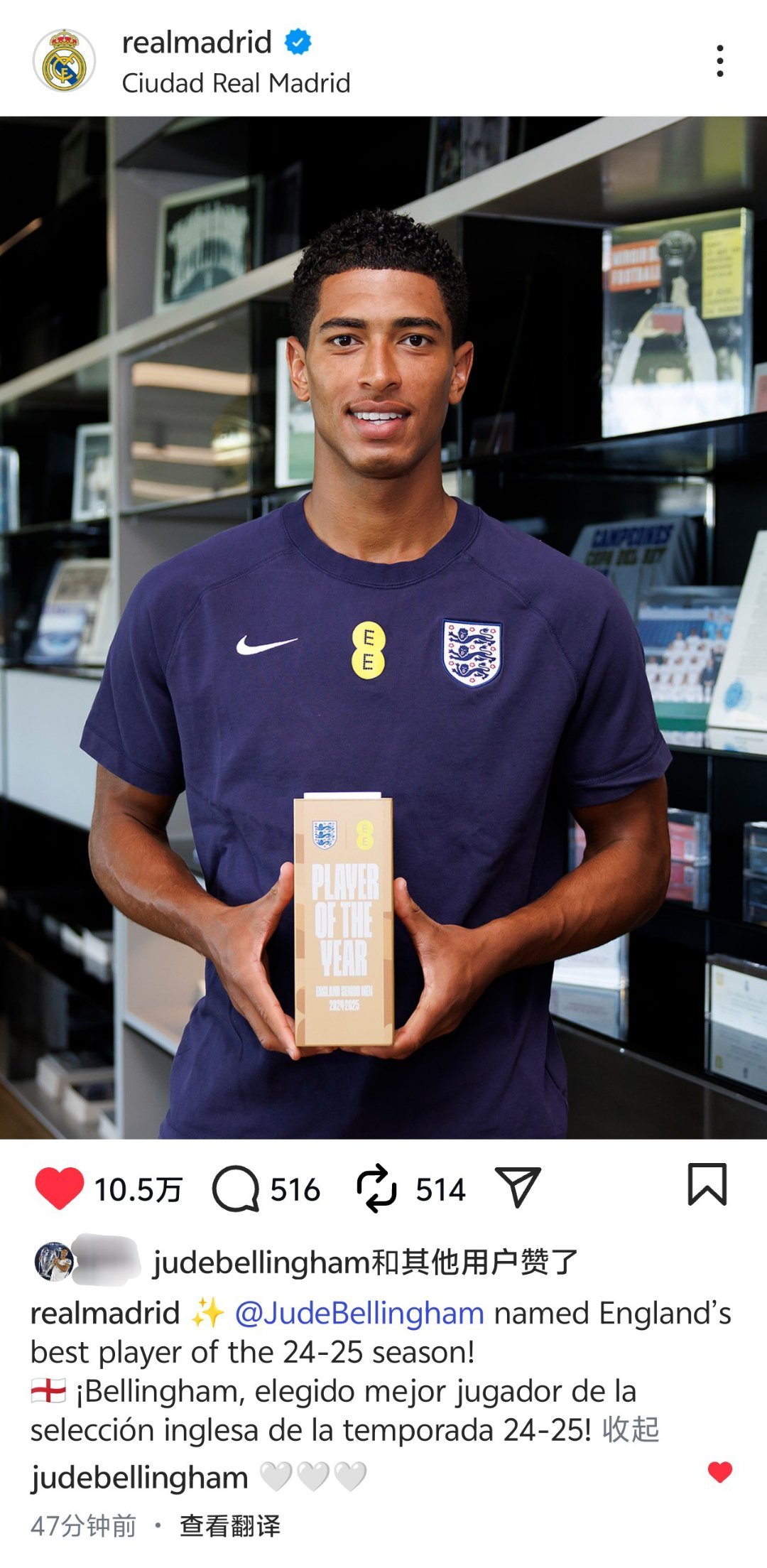 皇马也恭喜了贝林获得英格兰24-25赛季最佳球员[期待][爱你]