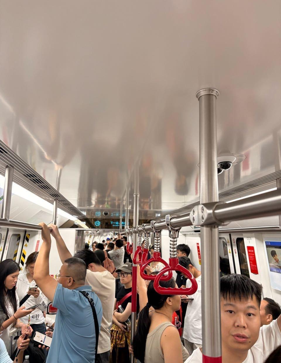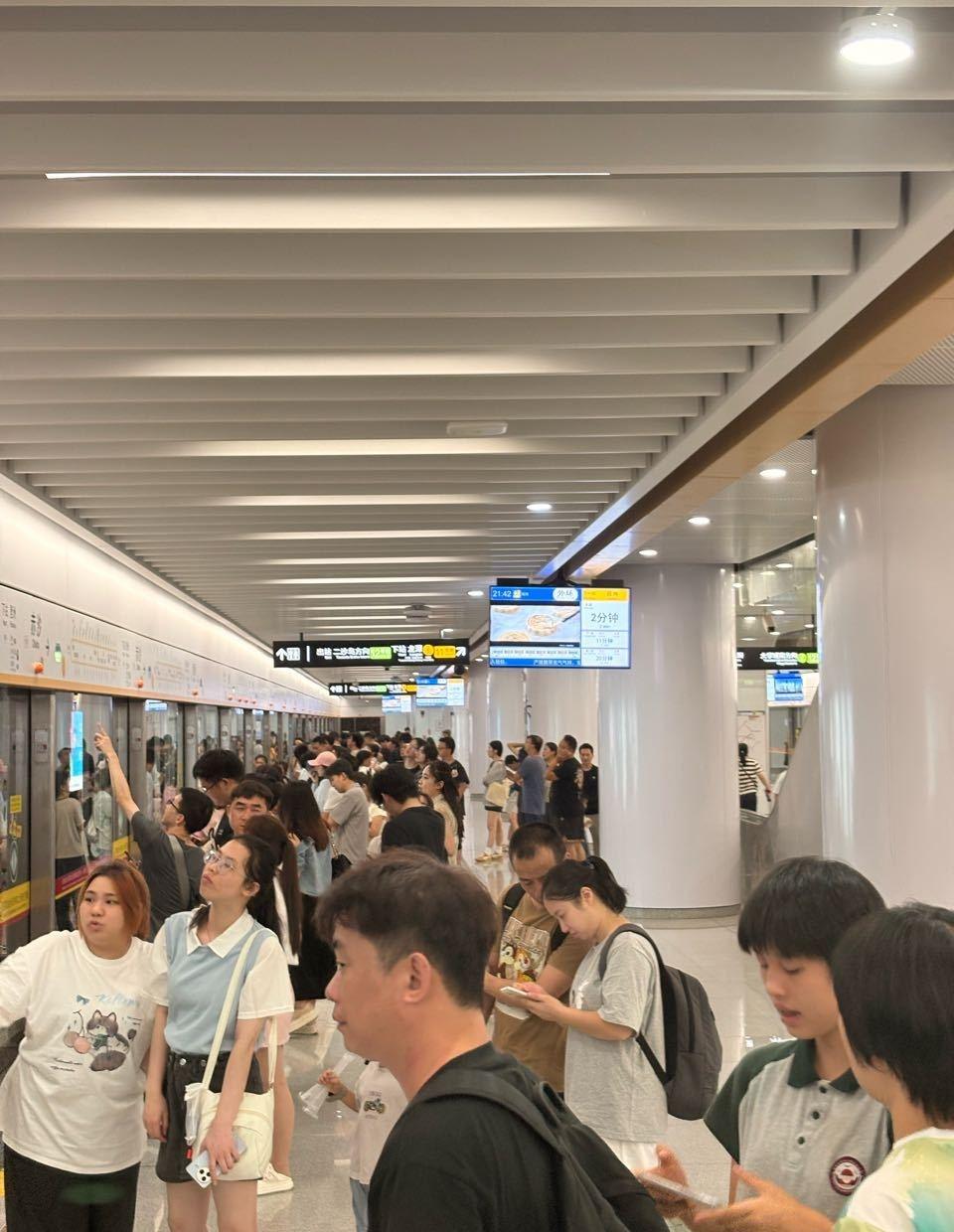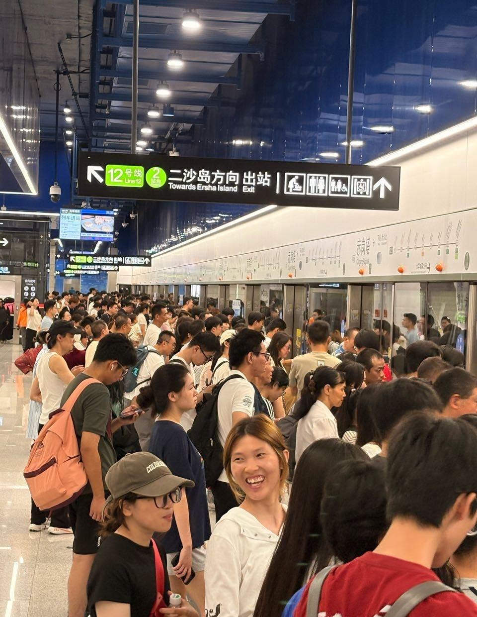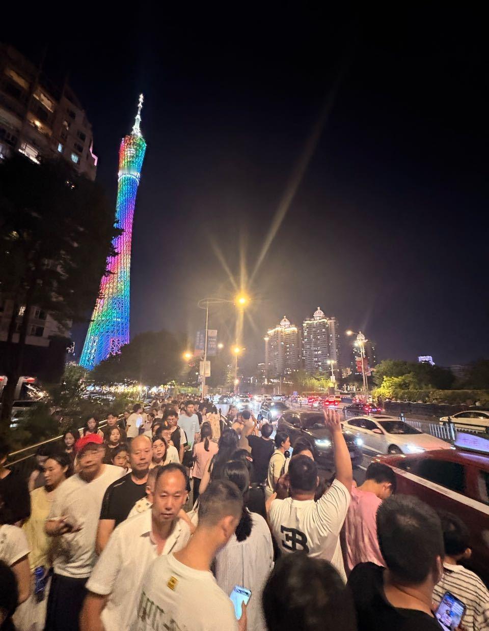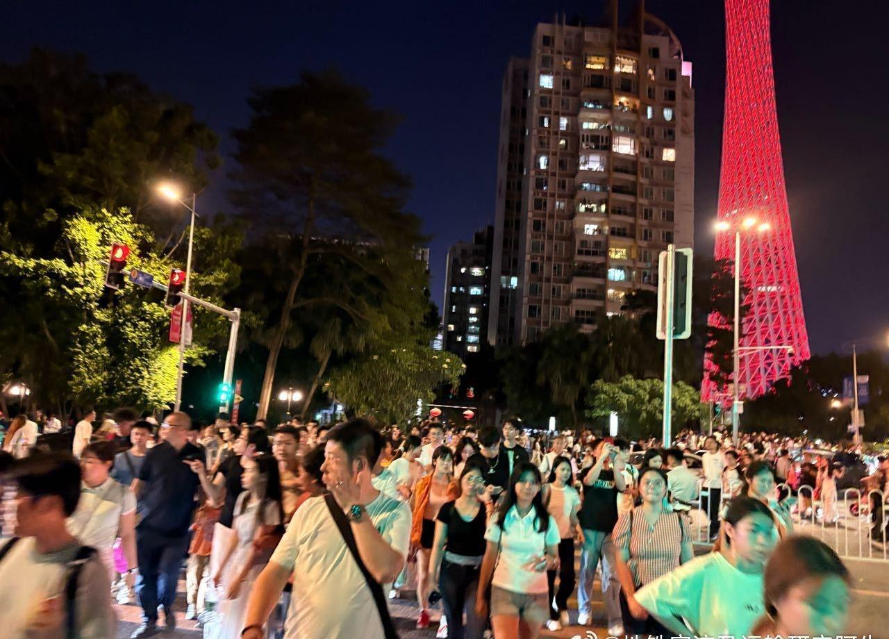 网友:2025年10月2日(国庆假期第二天 周四,广州天气晴朗),广州塔景区似乎比昨日更多。晚7点半,广州塔联调中心指示客村站客控,外站派遣十余位志愿者前去支援。 图一,为晚8:30左右仍在客控中的客村站。晚9:10客控结束。 图二、图三,为晚9:00前后的广州塔景区外围。 图四,为广州地铁多次、今日全天在线网各站高强度宣传的12号线赤岗塔站(500m外)。 图五,为12号线大学城南方向赤岗塔-赤沙北区间。平日该时间段一趟车约10人。 图六,为与12号线赤岗塔站高度联动的11、12号线同台换乘的赤沙站11号线站台。 ——今日908.8?