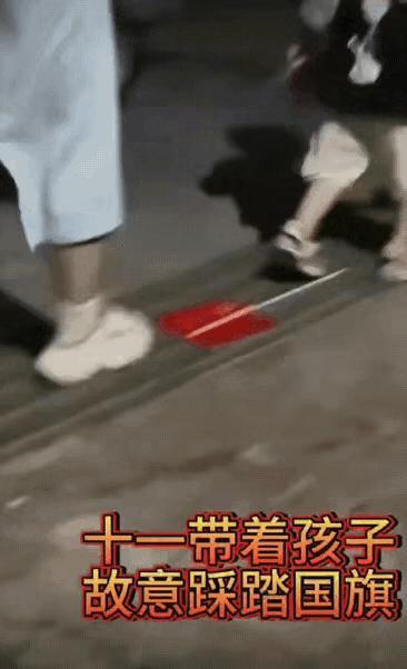 十一国庆节当天,一个当妈的在路上故意踩踏国旗。旁边的孩子看到后,也跟着妈妈学,回头狠狠踩了一脚。