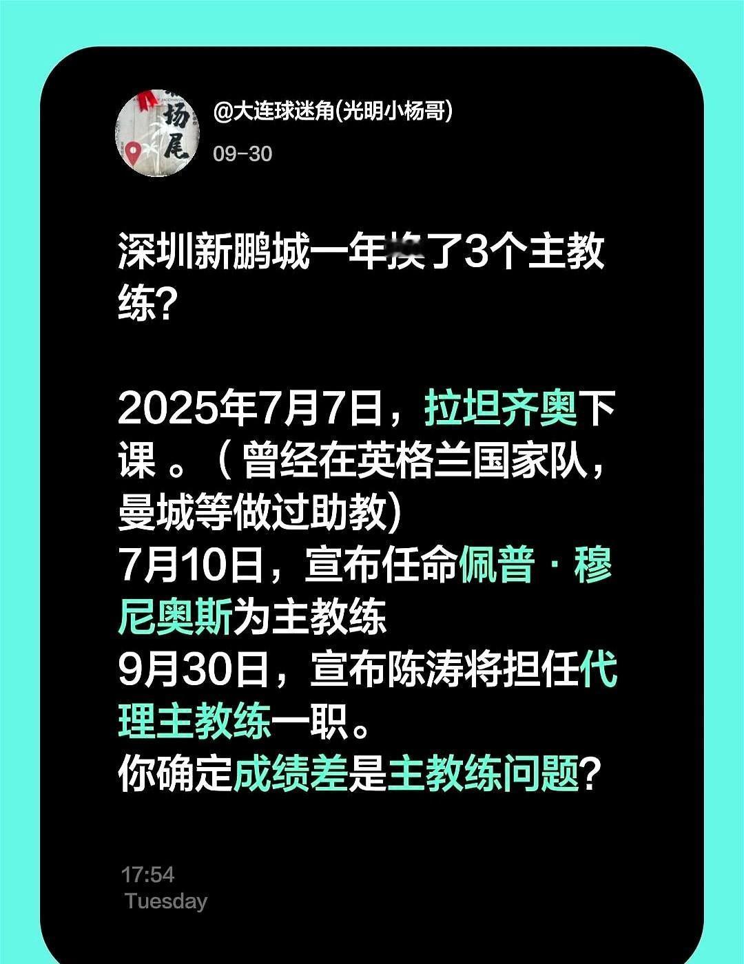 陈涛不是来当救火队员的,是来当实验品的。 俱乐部不给钱,不给主场,不给时间,只给两条铁律:迟到停赛,心率不达标别上场。 他签的不是合同,是卖身契。 球迷骂了半年“下课”,突然改口“给涛哥时间”。 不是他多牛,是大家累了。 换帅换到麻木,连骂都懒得骂了。 冬训前三场客场,惠州、佛山,全是陌生球场。 票房要再跌两成,U23必须用满三成,钱卡死,人压死。 他手里没外援,没转会费,只有两个字:执行。 没人指望他带球队冲亚冠。 但要是11月前,他能把两场异地战拿成6分, 那这三个月的换帅风暴, 就真不是闹剧—— 是CFG在用中国本土教练, 试一套没人敢碰的低成本活法。