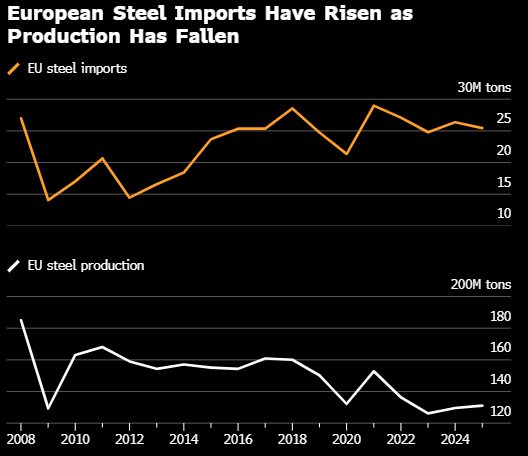 根据一份提议草案,欧盟计划将钢铁进口关税上调至50%,并拟将钢铁进口配额削减近一半。