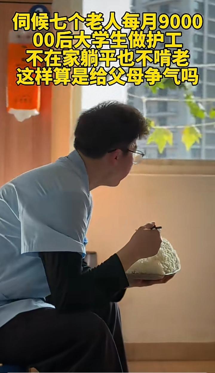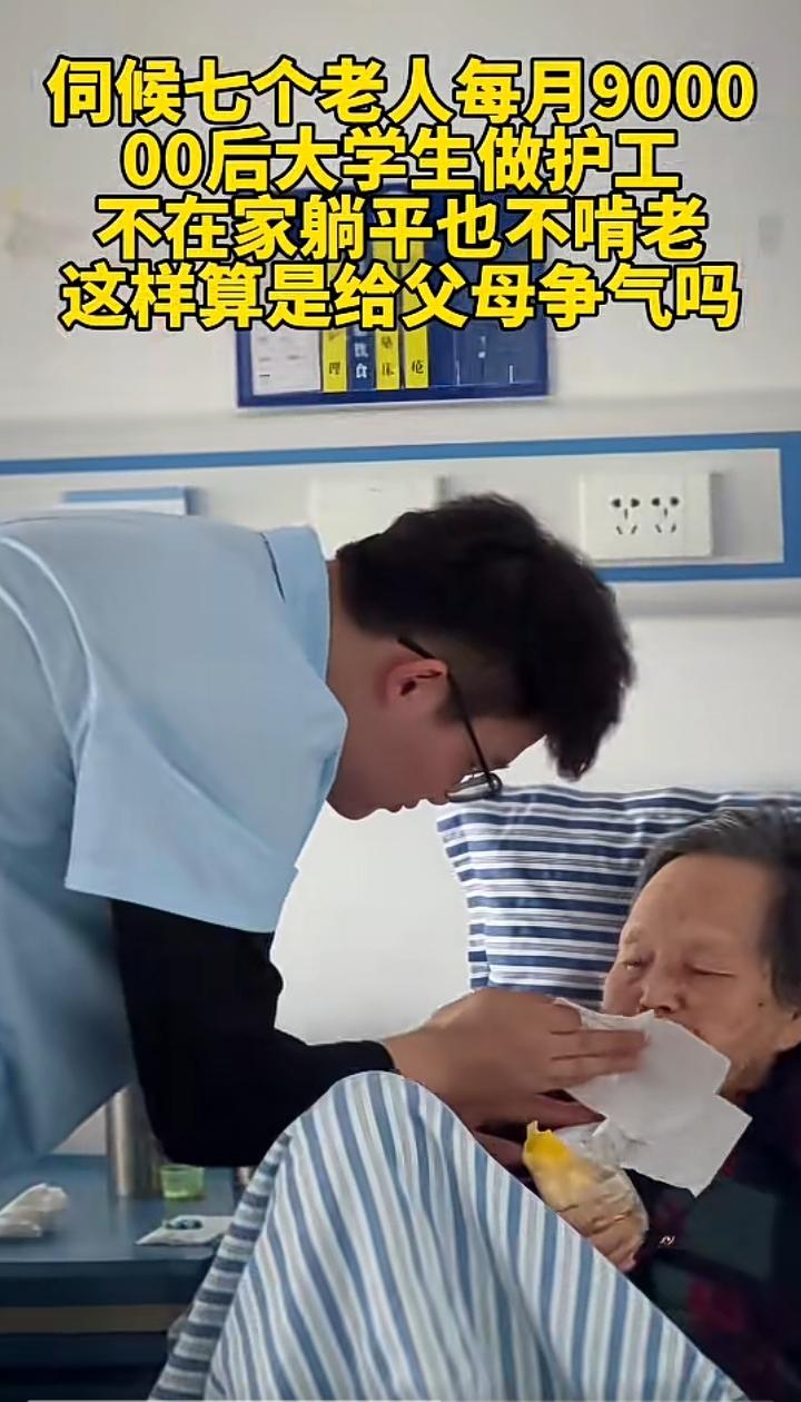 00后大学生毕业后找不到合适的专业,机缘巧合进入护工行业,一个人伺候7位老人每个月9000元,被家人嫌弃大学白读了。 可他自己说干这个心里特别踏实一起毕业的很多还在找工作,有的还啃老,而自己已经给家里寄过上万元的工资了,有时候他也审视过自己的选择,可眺望远方觉的老人易相处,不必去经历职场的勾心斗角为了升职去送礼,大学生文员五天八小时也就4500的底薪,基本礼拜六礼拜天是不加班,等升到行政管理已经是五年后或者还是原地踏步,升职后不过也才8000元底薪或者有其它福利奖金,兜兜转转还不如护工一个月9000来的实在,虽然发展前途有限,不过知足其实也是一种福气,另外最重要的就是他饭量大,在这里院长说敞开肚皮吃,不要在意别人的眼光,想打多少饭就打多少,只要不浪费就行,就这一点他觉得蛮符合自己的价值观,还有一点就是每天12个小时随时恭候,根本没时刻出去消费,这样每个月就是之进不出的纯收入,所以以后会加倍努力工作,争取年底找个女朋友。