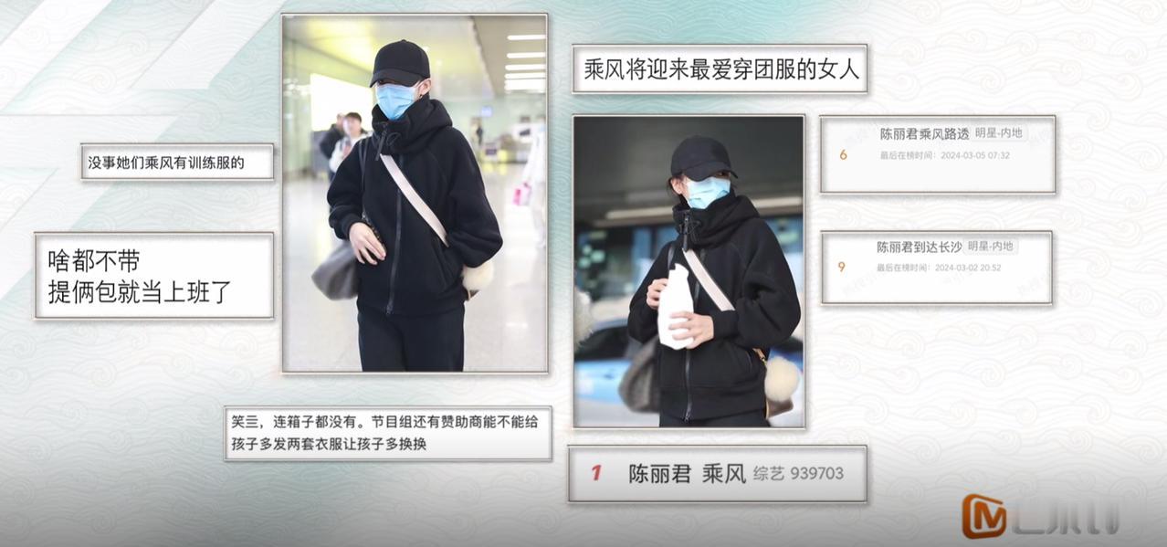 陈丽君在上一种很新型的浪姐!浪5开播!别家姐姐都是至少带一个行李箱,有的甚至2个3个。陈丽君这边倒好,直接挎2个小包就来上班了,不知道还以为她家就在芒果旁边呢!而且君君还特别爱穿团服 ,网友都急了,急呼节目组和赞助商,能不能多发两套衣服让孩子多换换!哈哈哈哈哈笑亖啦!