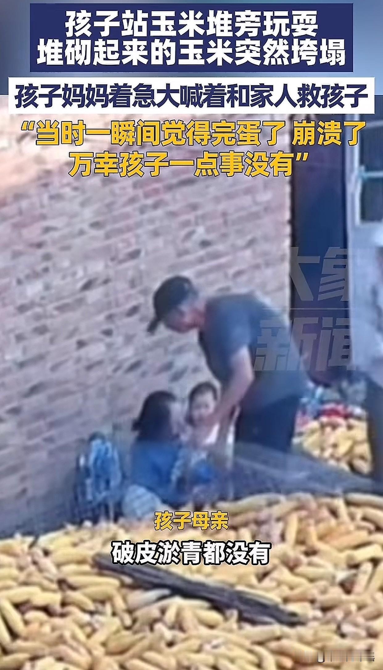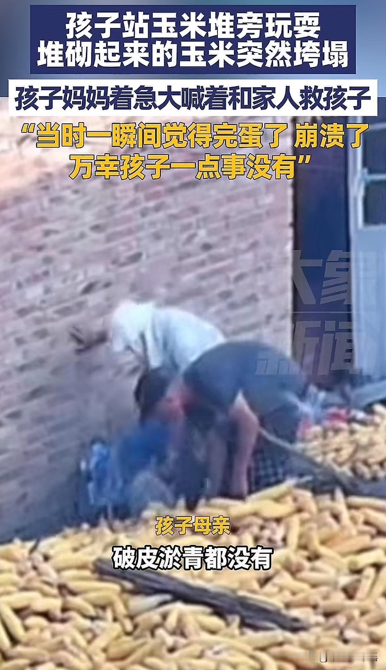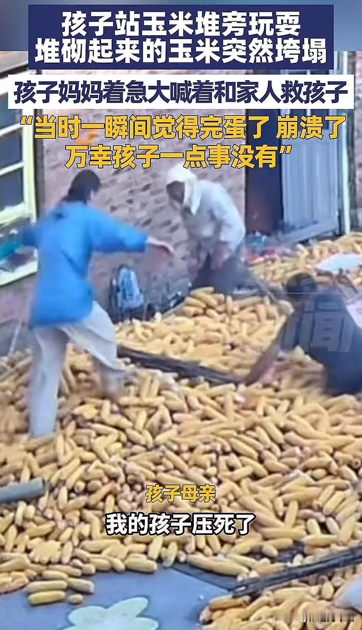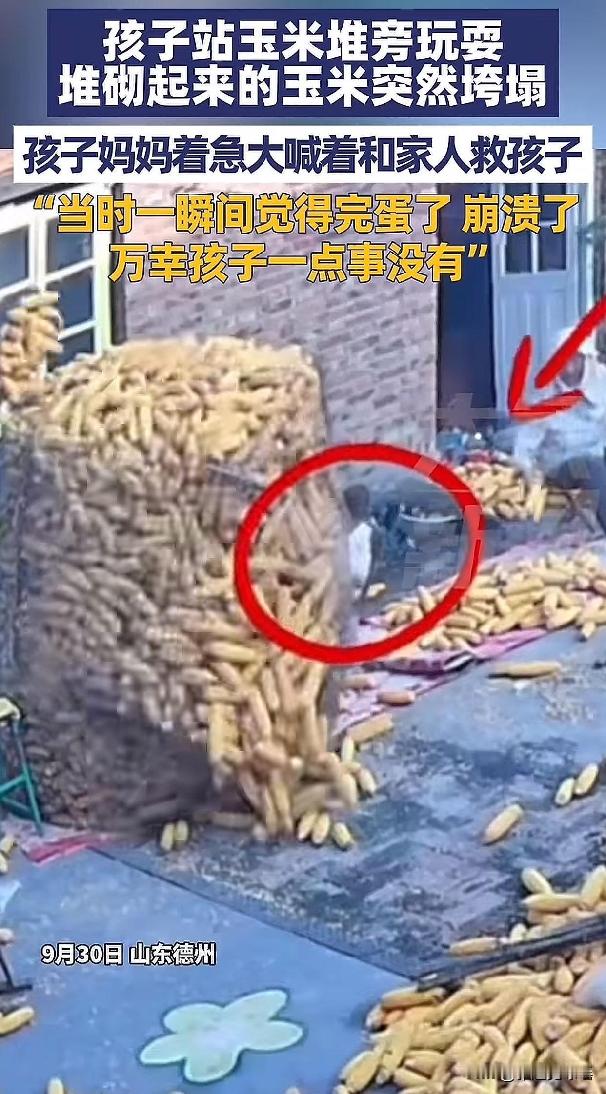 “太惊险了!”山东德州一农家院里玉米堆突然倒下来,上百斤的玉米直接把一个小宝宝埋在了下面!爷爷奶奶和妈妈吓得赶紧冲过去,一边哭一边扒拉铁丝网。爷爷着急得都摔倒了,也顾不上自己疼,赶紧爬起来看孙女。幸好最后孩子没事,但说实话,这一下可真把全家人都吓坏了。 我觉得在农村带孩子真的挺不容易。一边要忙农活,一边还得盯着孩子,危险的地方实在太多了。要我说啊,最好给孩子划个安全玩耍的区域,远离水井、农机这些地方,那些锄头、镰刀什么的也得收好。 带孩子真的一点都不能大意。千万别等出事了再后悔,眼睛得时刻盯着孩子才行。你们觉得呢?
