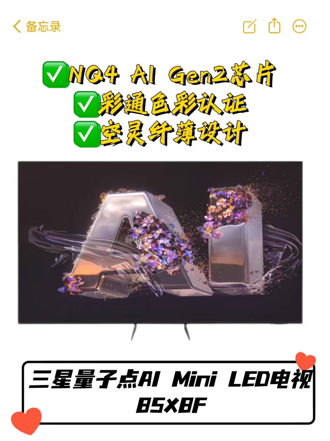 这个夏天的快乐莫过于下班早早飞奔回家,和家人一起围坐在客厅观看苏超啦!喝点啤酒再来点麻辣小龙虾~守在新买的三星量子点AI Mini LED电视85X8F前,这种快乐谁懂! 先夸爆它的颜值!超窄边框往墙上一挂,几乎满屏都是画面,机身最厚的地方也才2.7cm,和我家极简风背景墙简直绝配!而且搭载三星艺术画廊模式,客厅秒变艺术馆,再也没有老式电视的笨重感,往那一站就是客厅的颜值担当,朋友来都问链接! 但咱可不是只看脸!这台电视的实力才是让我彻底沦陷的关键! 👉先说沉浸感!85 寸量子点Mini LED巨幕 + 4K AI画质芯片,真的绝了!安装上之后,周末窝在沙发看大片,感觉自己直接坐在电影院里!就连看综艺,爱豆的睫毛根根分明,细节拉满,快乐直接翻倍! 👉再说说色彩!三星的显示技术果然名不虚传,彩通色彩认证,色彩饱满又自然,一点都不刺眼。不管是看风景片里的绿水青山,还是看剧里的人物肤色,都像透过一扇窗户看真实世界一样,眼睛看久了也舒服。 👉最让我惊喜的是它的智能操作!流畅到飞起,语音控制超方便,想看电影、查天气,动动嘴就行,完全不用到处找遥控器。平时用唱唱歌、看健身教程、玩游戏,巨爽!它哪里只是一台电视,明明就是我家的娱乐中心! 而且宝子们,我当时是在京东买的,真的要夸爆京东的服务!首先,90 天只换不修,要是 plus 会员还能享 180 天,买家电最担心的售后问题直接解决,特别安心。其次,要是在售后时效内想退换货,京东物流免费上门,完全不用自己折腾。还有 30 天价保,买完不怕降价吃亏,1 年质保也让人特别放心。最贴心的是送装一体服务,下单的时候就包含了基础挂墙安装费,师傅上门安装专业又麻利,省心又省力! 想提升居家幸福感的宝子,要是你也想要一台兼顾颜值和实力的顶级大屏电视,这台三星量子点电视85X8F真的可以闭眼入!9月叠加国补优惠,爆款直降85折,现在去京东搜索【国补抢百寸】进入会场就能 get 同款,而且上京东看苏超抽大奖还能赢取百寸电视免单,赶紧冲!
