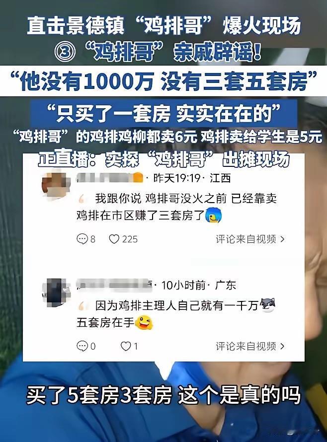 6元鸡排卖成网红 鸡排哥清醒让人佩服 近日,江西景德镇有个李俊永,大家都叫他“鸡排哥”。他火了。火的原因不只是他那6块钱一份的鸡排,更是他那张能说会道的嘴。 他卖鸡排像说脱口秀,逗得客人哈哈笑。很多人专门跑来,不只为吃鸡排,就为听他说两句,图个开心。 他的鸡排每天新鲜腌制,不用半成品。这份实在和人情味,让6块钱花得特别值。 人一红,传言就来了。网上说他靠这个买了好几套房。鸡排哥直接回应,家里就一套老房子,一家人住了几十年。他说自己离一个亿的小目标还差得远,还幽默地对大家说“你多来,我才能多卖两份”。 面对突然的流量,他特别清醒。很多找上门的连锁加盟机会,他都拒绝了。他就想守着自己的小摊,实实在在做生意。 当地城管部门也没闲着。他们没去简单驱赶,反而派了专人维持秩序,帮他规范经营。这波热度,甚至还成了推广景德镇文旅的一个好机会。 鸡排哥说,幸福就是每天努力一点,朝着一个方向前进。他没被爆红冲昏头,该干啥还干啥。这份平常心和踏实劲儿,在当下的网红圈里真不多见。东西实在,人也实在,这大概就是他最吸引人的地方。 (素材来源网络)