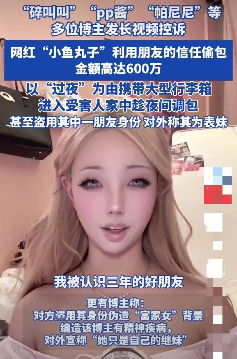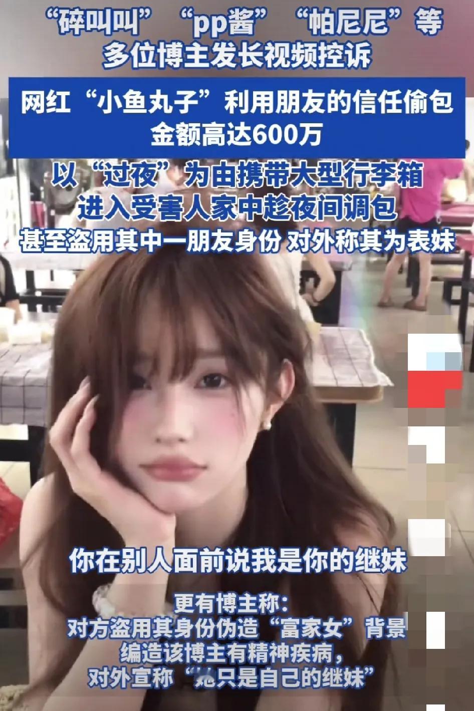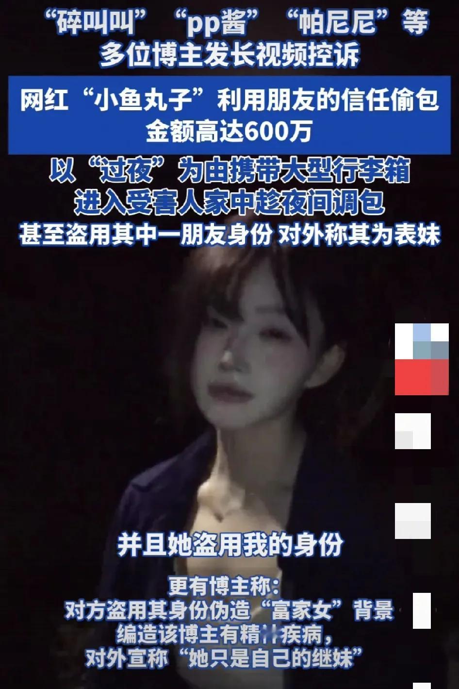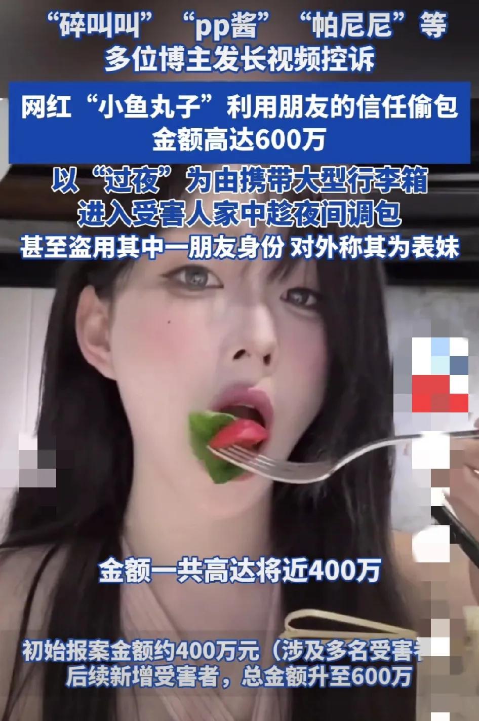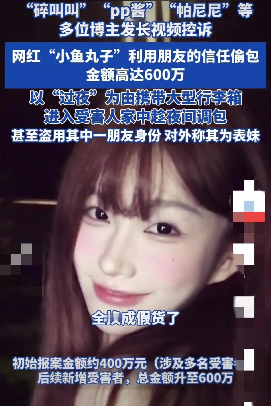 卿本佳人奈何做贼呢!还好不是桑冲!要不博主们还得人货两失! 据报道,多名博主(如“碎叫叫”“PP酱”)指控“小鱼丸子”长期以“借宿”为名,携带大型行李箱进入朋友家中,通过观察常用奢侈品款式,定制假货调换真品。受害者发现后,总金额从400万升至600万。 再有,此女利用“二手奢侈品生意”身份掩盖假货来源,将赮物通过二手渠道转卖。盗用他人身份伪造“富家女”背景,编造“继妹有精神疾病”等谎言。 从调包到销赃形成完整产业链,甚至将赃物伪造成“家人馈赠”进行二次销售。 另外,此案突破普通盗窃范畴,暴露了网红圈信任危机与价值观扭曲问题。涉案者通过伪造人设获取信任,最终演变为对朋友、亲人甚至社会规则的全面欺骗。目前案件已进入司法调查阶段。