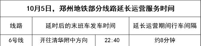 郑州地铁国庆期间调整运营时间 9月30日、10月1日、10月7日及8日,地铁线网运营时间总体延长至次日0:00,延长期间行车间隔8分钟至15分钟。 🚇温馨提醒:9月30日(星期二),地铁2号线与城郊线大站快车暂停开行。优化重点时段行车安排。 10月1日、7日及8日1号线、2号线与城郊线使用专用运行图,其中1号线22:00后行车间隔调整为约8分钟;2号线与城郊线14:00~20:00小交路调整为刘庄站至孟庄站,小交路行车间隔约3分半,大交路行车间隔约7分半。 🚇10月5日奥体中心体育馆活动期间,6号线开往清华附中方向的末班车由22:30延长至22:40,行车间隔约8分钟;10号线开往郑州火车站方向的末班车由22:25延长至23:00,延长期间行车间隔约10分钟。 国庆在郑州或者要来郑州玩的宝子们,可以点进郑宝主页看看哦,整理了很多活动呢 郑州 国庆出行 郑州地铁 地铁 国庆 国庆出行 郑州旅游 郑州游玩